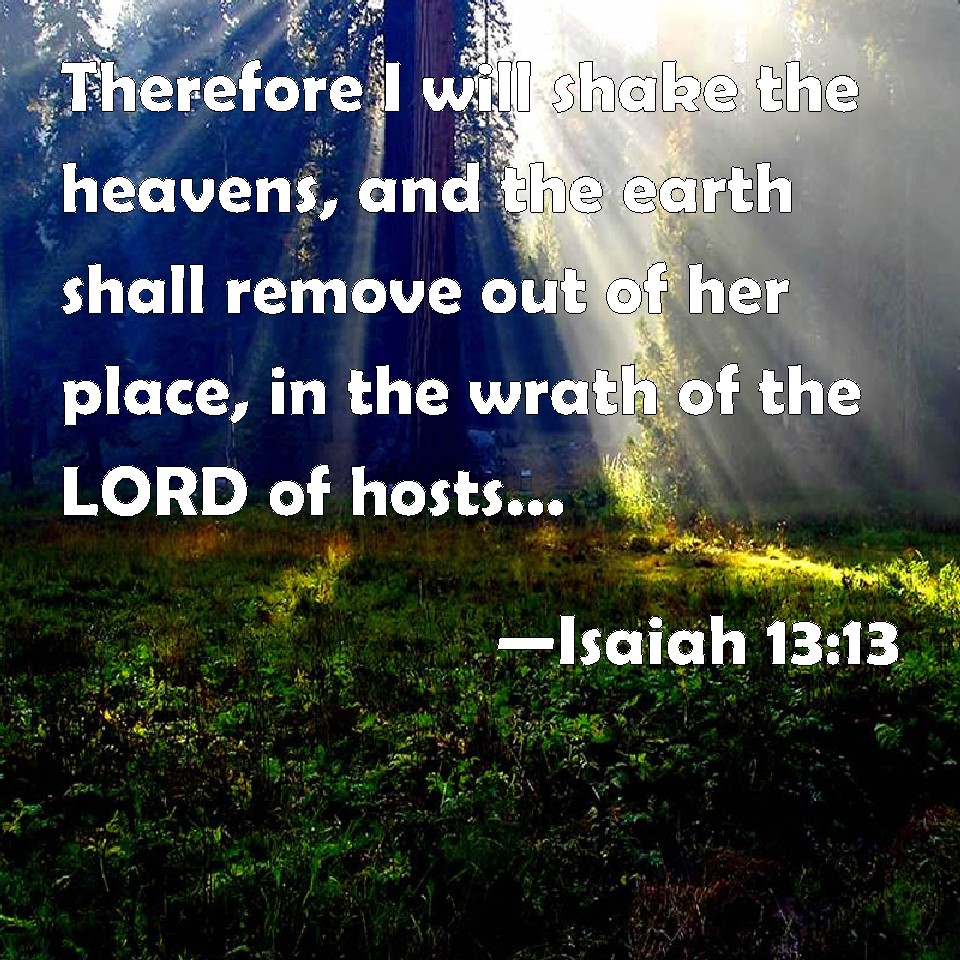 Choose a Background Isaiah 13:13 Therefore I will shake the heavens, and the earth shall remove out of her place, in the wrath of the LORD of hosts, and in the day of his fierce anger. KJV: Therefore I will shake the heavens, and the earth shall remove out of her place, in the wrath of the LORD of hosts, and in the day of his fierce anger. DRB: For this I will trouble the heaven: and the earth shall be moved out of her place, for the indignation of the Lord of hosts, and for the day of his tierce wrath. DBT: Therefore I will make the heavens to shake, and the earth shall be removed out of her place, at the wrath of Jehovah of hosts, and in the day of his fierce anger. ERV: Therefore I will make the heavens to tremble, and the earth shall be shaken out of her place, in the wrath of the LORD of hosts, and in the day of his fierce anger. WBT: Therefore I will shake the heavens, and the earth shall remove out of her place, in the wrath of the LORD of hosts, and in the day of his fierce anger. WEB: Therefore I will make the heavens tremble, and the earth will be shaken out of its place in the wrath of Yahweh of Armies, and in the day of his fierce anger. YLT: Therefore the heavens I cause to tremble, And the earth doth shake from its place, In the wrath of Jehovah of Hosts, And in a day of the heat of his anger.Links Isaiah 13:13 NIV • Isaiah 13:13 NLT • Isaiah 13:13 ESV • Isaiah 13:13 NASB • Isaiah 13:13 KJV • Isaiah 13:13 Interlinear • Isaiah 13:13 Commentaries • Isaiah 13:13 Parallel Texts • Isaiah 13:13 Bible Apps • Isaiah 13:13 Parallel • Bible Hub |