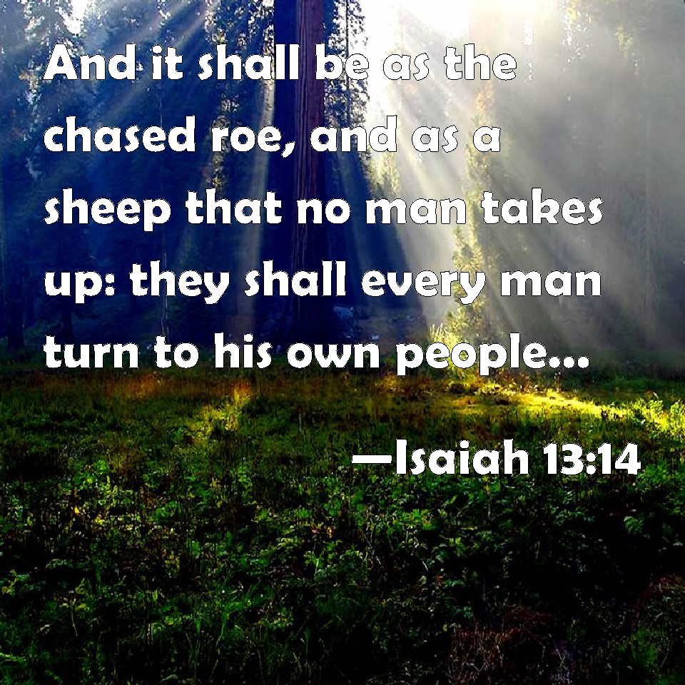 Choose a Background Isaiah 13:14 And it shall be as the chased roe, and as a sheep that no man takes up: they shall every man turn to his own people, and flee every one into his own land. KJV: And it shall be as the chased roe, and as a sheep that no man taketh up: they shall every man turn to his own people, and flee every one into his own land. DRB: And they shall be as a doe fleeing away, and as a sheep: and there shall be none to gather them together: every man shall turn to his own people, and every one shall flee to his own land. DBT: And it shall be as with a chased roe, and as with a flock that no man gathereth together; every one shall turn to his own people, and every one flee into his own land. ERV: And it shall come to pass, that as the chased roe, and as sheep that no man gathereth, they shall turn every man to his own people, and shall flee every man to his own land. WBT: And it shall be as the chased roe, and as a sheep that no man taketh up: they shall every man turn to his own people, and flee every one to his own land. WEB: It will happen that like a hunted gazelle, and like sheep that no one gathers, they will each turn to their own people, and will each flee to their own land. YLT: And it hath been, as a roe driven away, And as a flock that hath no gatherer, Each unto his people — they turn, And each unto his land — they flee.Links Isaiah 13:14 NIV • Isaiah 13:14 NLT • Isaiah 13:14 ESV • Isaiah 13:14 NASB • Isaiah 13:14 KJV • Isaiah 13:14 Interlinear • Isaiah 13:14 Commentaries • Isaiah 13:14 Parallel Texts • Isaiah 13:14 Bible Apps • Isaiah 13:14 Parallel • Bible Hub |