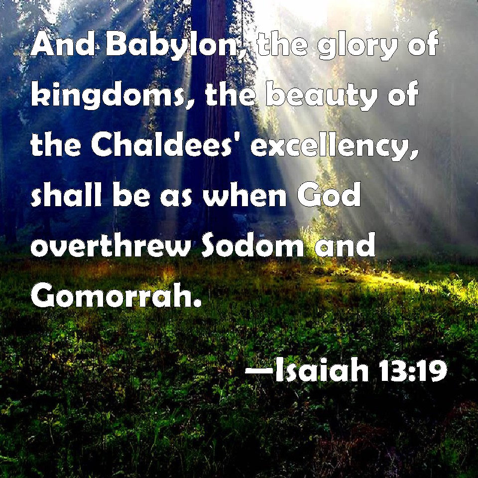 Choose a Background Isaiah 13:19 And Babylon, the glory of kingdoms, the beauty of the Chaldees' excellency, shall be as when God overthrew Sodom and Gomorrah. KJV: And Babylon, the glory of kingdoms, the beauty of the Chaldees' excellency, shall be as when God overthrew Sodom and Gomorrah. DRB: And that Babylon, glorious among kingdoms, the famous pride of the Chaldeans, shall be even as the Lord destroyed Sodom and Gomorrha. DBT: And Babylon, the glory of kingdoms, the beauty of the Chaldeans' pride, shall be as when God overthrew Sodom and Gomorrah. ERV: And Babylon, the glory of kingdoms, the beauty of the Chaldeans' pride, shall be as when God overthrew Sodom and Gomorrah. WBT: And Babylon, the glory of kingdoms, the beauty of the Chaldees' excellence, shall be as when God overthrew Sodom and Gomorrah. WEB: Babylon, the glory of kingdoms, the beauty of the Chaldeans' pride, will be like when God overthrew Sodom and Gomorrah. YLT: And Babylon, the beauty of kingdoms, The glory, the excellency of the Chaldeans, Hath been as overthrown by God, With Sodom and with Gomorrah.Links Isaiah 13:19 NIV • Isaiah 13:19 NLT • Isaiah 13:19 ESV • Isaiah 13:19 NASB • Isaiah 13:19 KJV • Isaiah 13:19 Interlinear • Isaiah 13:19 Commentaries • Isaiah 13:19 Parallel Texts • Isaiah 13:19 Bible Apps • Isaiah 13:19 Parallel • Bible Hub |