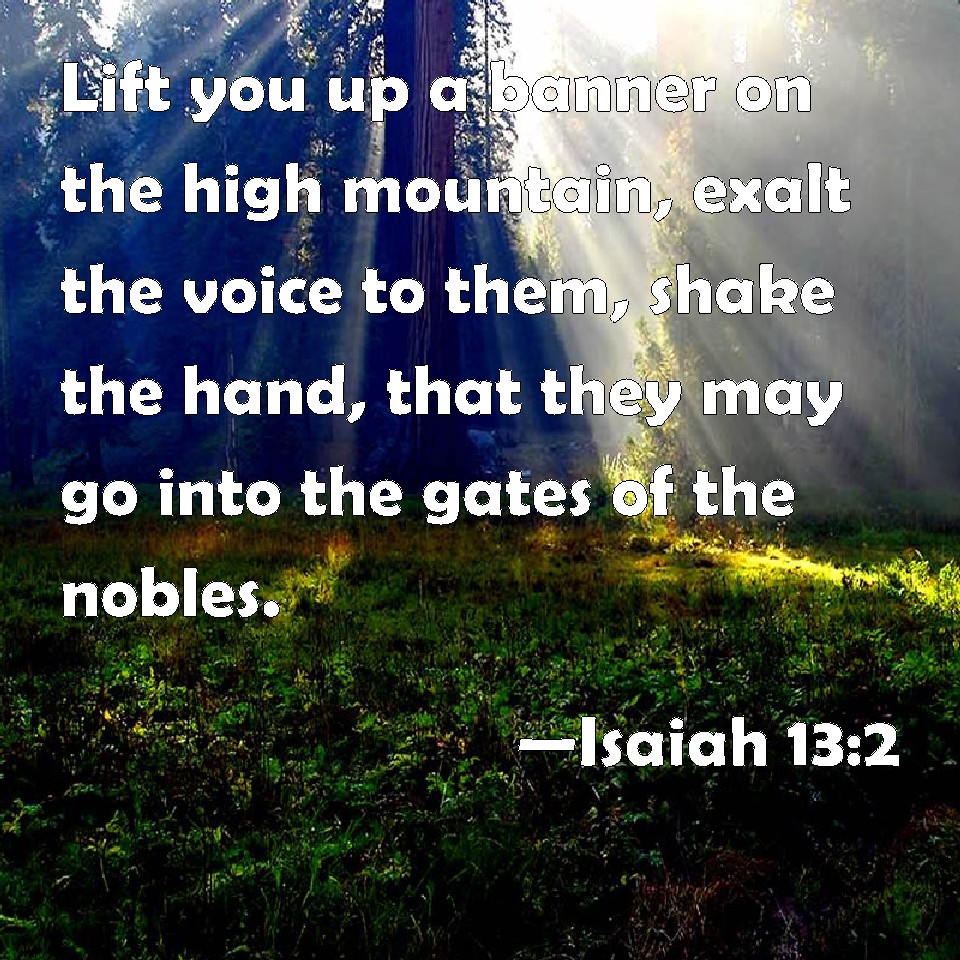 Choose a Background Isaiah 13:2 Lift you up a banner on the high mountain, exalt the voice to them, shake the hand, that they may go into the gates of the nobles. KJV: Lift ye up a banner upon the high mountain, exalt the voice unto them, shake the hand, that they may go into the gates of the nobles. DRB: Upon the dark mountain lift ye up a banner, exalt the voice, lift up the hand, and let the rulers go into the gates. DBT: Lift up a banner upon a bare mountain, raise the voice unto them, shake the hand, that they may enter the gates of the nobles. ERV: Set ye up an ensign upon the bare mountain, lift up the voice unto them, wave the hand, that they may go into the gates of the nobles. WBT: Lift ye up a banner upon the high mountain, exalt the voice to them, shake the hand, that they may go into the gates of the nobles. WEB: Set up a banner on the bare mountain! Lift up your voice to them! Wave your hand, that they may go into the gates of the nobles. YLT: 'On a high mountain lift ye up an ensign, Raise the voice to them, wave the hand, And they go in to the openings of nobles.Links Isaiah 13:2 NIV • Isaiah 13:2 NLT • Isaiah 13:2 ESV • Isaiah 13:2 NASB • Isaiah 13:2 KJV • Isaiah 13:2 Interlinear • Isaiah 13:2 Commentaries • Isaiah 13:2 Parallel Texts • Isaiah 13:2 Bible Apps • Isaiah 13:2 Parallel • Bible Hub |