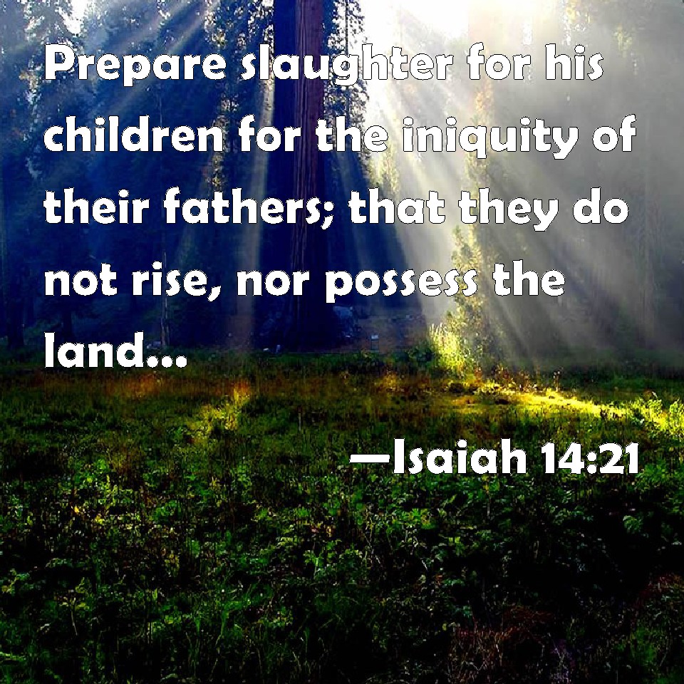 Choose a Background Isaiah 14:21 Prepare slaughter for his children for the iniquity of their fathers; that they do not rise, nor possess the land, nor fill the face of the world with cities. KJV: Prepare slaughter for his children for the iniquity of their fathers; that they do not rise, nor possess the land, nor fill the face of the world with cities. DRB: Prepare his children for slaughter for the iniquity of their fathers: they shall not rise up, nor inherit the land, nor fill the face of the world with cities. DBT: Prepare ye slaughter for his children, because of the iniquity of their fathers; that they may not rise up and possess the earth, nor fill the face of the world with cities. ERV: Prepare ye slaughter for his children for the iniquity of their fathers; that they rise not up, and possess the earth, and fill the face of the world with cities. WBT: Prepare slaughter for his children for the iniquity of their fathers; that they may not rise, nor possess the land, nor fill the face of the world with cities. WEB: Prepare for slaughter of his children because of the iniquity of their fathers, that they not rise up and possess the earth, and fill the surface of the world with cities. YLT: Prepare ye for his sons slaughter; Because of the iniquity of their fathers, They rise not, nor have possessed the land, Nor filled the face of the world with cities.Links Isaiah 14:21 NIV • Isaiah 14:21 NLT • Isaiah 14:21 ESV • Isaiah 14:21 NASB • Isaiah 14:21 KJV • Isaiah 14:21 Interlinear • Isaiah 14:21 Commentaries • Isaiah 14:21 Parallel Texts • Isaiah 14:21 Bible Apps • Isaiah 14:21 Parallel • Bible Hub |