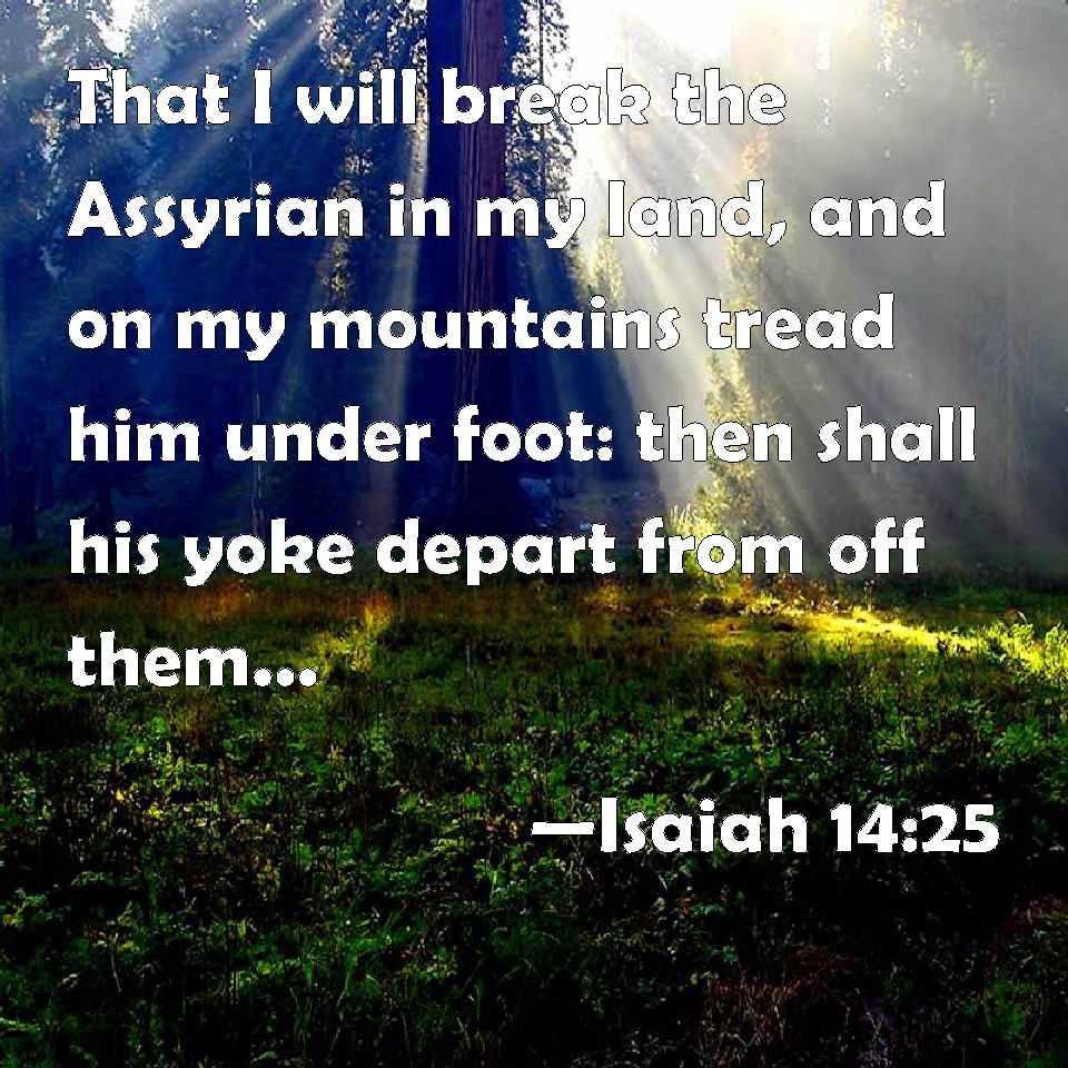 Choose a Background Isaiah 14:25 That I will break the Assyrian in my land, and on my mountains tread him under foot: then shall his yoke depart from off them, and his burden depart from off their shoulders. KJV: That I will break the Assyrian in my land, and upon my mountains tread him under foot: then shall his yoke depart from off them, and his burden depart from off their shoulders. DRB: So shall it fall out: That I will destroy the Assyrian in my land, and upon my mountains tread him under foot: and his yoke shall be taken away from them, and his burden shall be taken off their shoulder. DBT: to break the Assyrian in my land; and upon my mountains will I tread him under foot; and his yoke shall depart from off them, and his burden depart from off their shoulders. ERV: that I will break the Assyrian in my land, and upon my mountains tread him under foot: then shall his yoke depart from off them, and his burden depart from off their shoulder. WBT: That I will break the Assyrian in my land, and upon my mountains tread him under foot: then shall his yoke depart from off them, and his burden depart from off their shoulders. WEB: that I will break the Assyrian in my land, and tread him under foot on my mountains. Then his yoke will leave them, and his burden leave their shoulders. YLT: To break Asshur in My land, And on My mountains I tread him down, And turned from off them hath his yoke, Yea, his burden from off their shoulder turneth aside.Links Isaiah 14:25 NIV • Isaiah 14:25 NLT • Isaiah 14:25 ESV • Isaiah 14:25 NASB • Isaiah 14:25 KJV • Isaiah 14:25 Interlinear • Isaiah 14:25 Commentaries • Isaiah 14:25 Parallel Texts • Isaiah 14:25 Bible Apps • Isaiah 14:25 Parallel • Bible Hub |