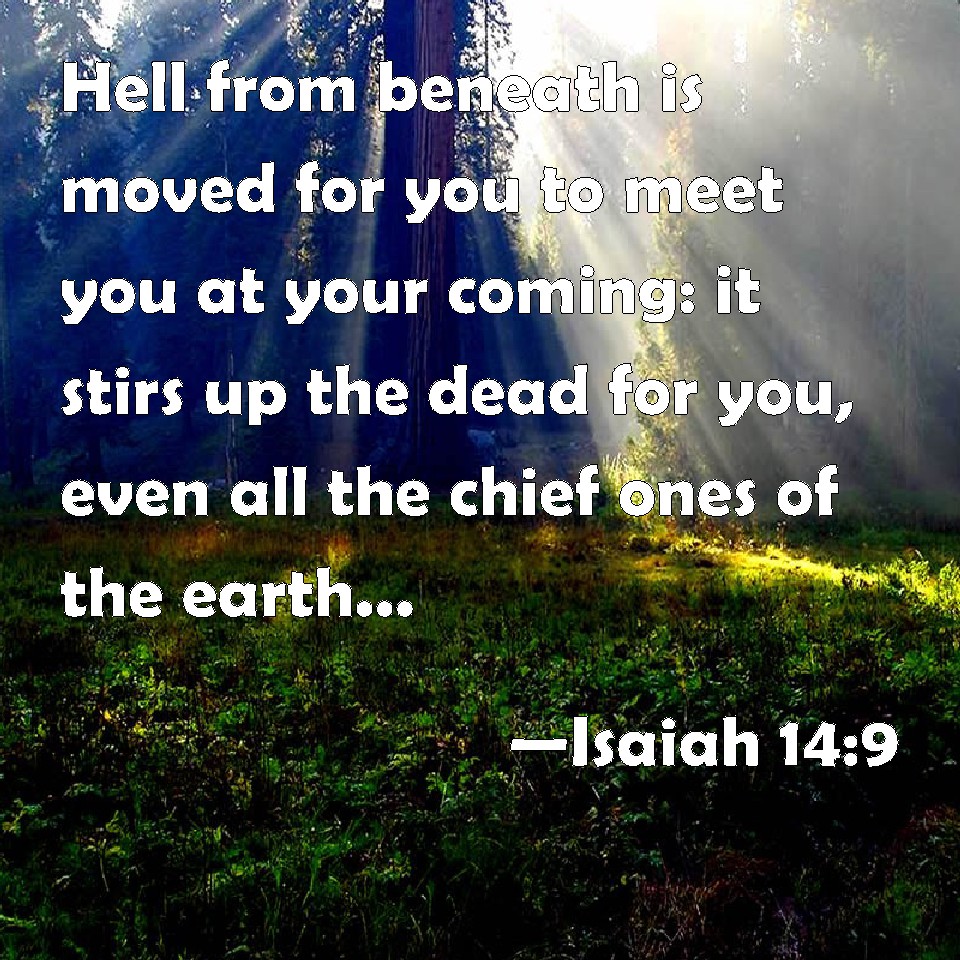Choose a Background Isaiah 14:9 Hell from beneath is moved for you to meet you at your coming: it stirs up the dead for you, even all the chief ones of the earth; it has raised up from their thrones all the kings of the nations. KJV: Hell from beneath is moved for thee to meet thee at thy coming: it stirreth up the dead for thee, even all the chief ones of the earth; it hath raised up from their thrones all the kings of the nations. DRB: Hell below was in an uproar to meet thee at thy coming, it stirred up the giants for thee. All the princes of the earth are risen up from their thrones, all the princes of nations. DBT: Sheol from beneath is moved for thee to meet thee at thy coming, stirring up the dead for thee, all the he-goats of the earth; making to rise from their thrones all the kings of the nations. ERV: Hell from beneath is moved for thee to meet thee at thy coming: it stirreth up the dead for thee, even all the chief ones of the earth; it hath raised up from their thrones all the kings of the nations. WBT: Hell from beneath is moved for thee to meet thee at thy coming: it stirreth up the dead for thee, even all the chief ones of the earth; it hath raised up from their thrones all the kings of the nations. WEB: Sheol from beneath has moved for you to meet you at your coming. It stirs up the dead for you, even all the rulers of the earth. It has raised up from their thrones all the kings of the nations. YLT: Sheol beneath hath been troubled at thee, To meet thy coming in, It is waking up for thee Rephaim, All chiefs ones of earth, It hath raised up from their thrones All kings of nations.Links Isaiah 14:9 NIV • Isaiah 14:9 NLT • Isaiah 14:9 ESV • Isaiah 14:9 NASB • Isaiah 14:9 KJV • Isaiah 14:9 Interlinear • Isaiah 14:9 Commentaries • Isaiah 14:9 Parallel Texts • Isaiah 14:9 Bible Apps • Isaiah 14:9 Parallel • Bible Hub |