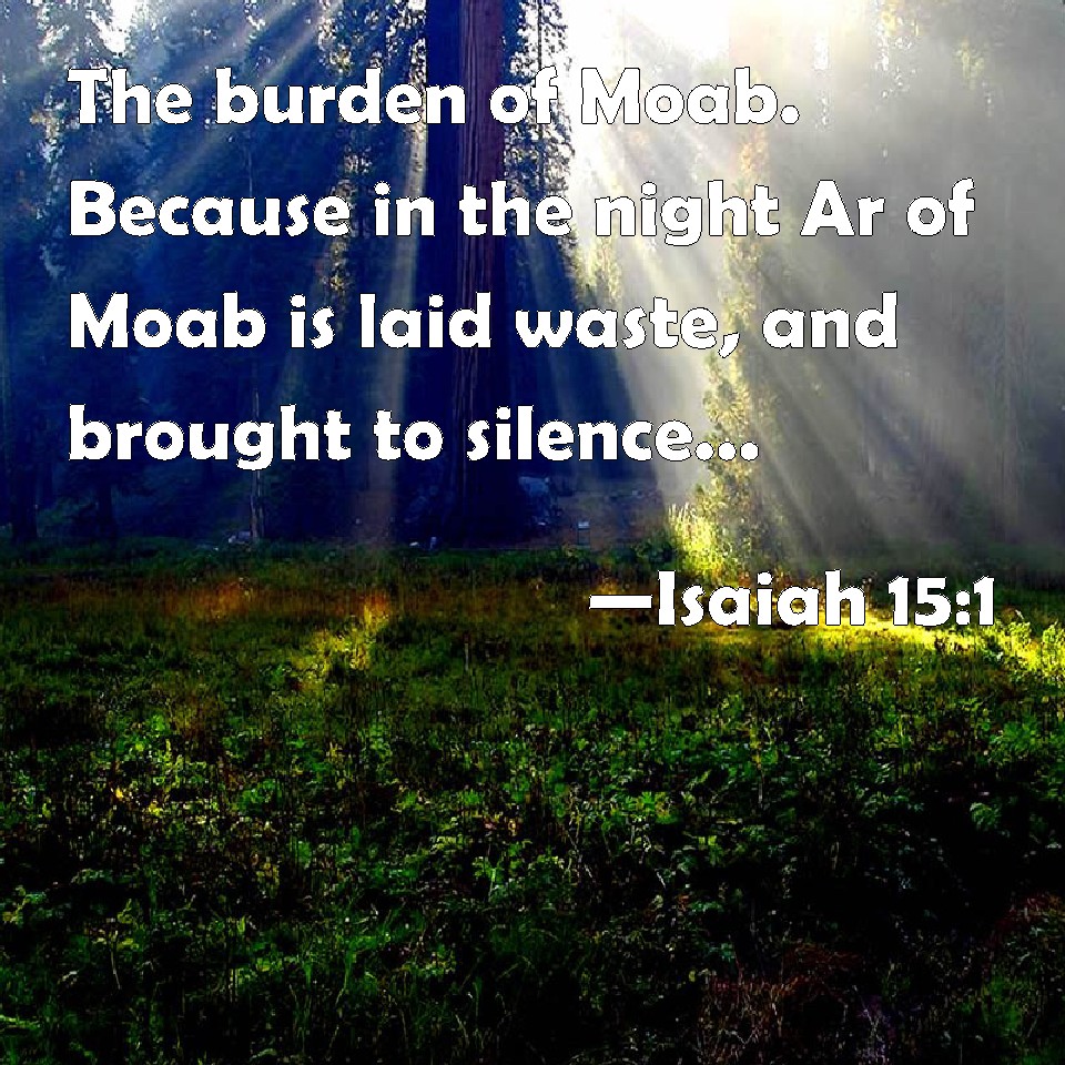 Choose a Background Isaiah 15:1 The burden of Moab. Because in the night Ar of Moab is laid waste, and brought to silence; because in the night Kir of Moab is laid waste, and brought to silence; KJV: The burden of Moab. Because in the night Ar of Moab is laid waste, and brought to silence; because in the night Kir of Moab is laid waste, and brought to silence; DRB: THE burden of Moab. Because in the night Ar of Moab is laid waste, it is silent: because the wall of Moab is destroyed in the night, it is silent. DBT: The burden of Moab: For in the night of being laid waste, Ar of Moab is destroyed; for in the night of being laid waste, Kir of Moab is destroyed! ERV: The burden of Moab. For in a night Ar of Moab is laid waste, and brought to nought; for in a night Kir of Moab is laid waste, and brought to nought. WBT: The burden of Moab. Because in the night Ar of Moab is laid waste, and brought to silence; because in the night Kir of Moab is laid waste, and brought to silence; WEB: The burden of Moab: for in a night, Ar of Moab is laid waste, and brought to nothing; for in a night Kir of Moab is laid waste, and brought to nothing. YLT: The burden of Moab. Because in a night destroyed was Ar of Moab — It hath been cut off, Because in a night destroyed was Kir of Moab — It hath been cut off.Links Isaiah 15:1 NIV • Isaiah 15:1 NLT • Isaiah 15:1 ESV • Isaiah 15:1 NASB • Isaiah 15:1 KJV • Isaiah 15:1 Interlinear • Isaiah 15:1 Commentaries • Isaiah 15:1 Parallel Texts • Isaiah 15:1 Bible Apps • Isaiah 15:1 Parallel • Bible Hub |