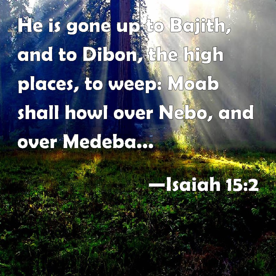 Choose a Background Isaiah 15:2 He is gone up to Bajith, and to Dibon, the high places, to weep: Moab shall howl over Nebo, and over Medeba: on all their heads shall be baldness, and every beard cut off. KJV: He is gone up to Bajith, and to Dibon, the high places, to weep: Moab shall howl over Nebo, and over Medeba: on all their heads shall be baldness, and every beard cut off. DRB: The house is gone up, and Dibon to the high places to mourn over Nabo, and over Medaba, Moab hath howled: on all their heads shall be baldness, and every beard shall be shaven. DBT: He is gone up to Bajith, and to Dibon, to the high places, to weep; Moab howleth over Nebo, and over Medeba; on all their heads is baldness, every beard is cut off. ERV: He is gone up to Bayith, and to Dibon, to the high places, to weep: Moab howleth over Nebo, and over Medeba: on all their heads is baldness, every beard is cut off. WBT: He is gone up to Bajith, and to Dibon, the high places, to weep: Moab shall howl over Nebo, and over Medeba: on all their heads shall be baldness, and every beard shorn. WEB: They have gone up to Bayith, and to Dibon, to the high places, to weep. Moab wails over Nebo and over Medeba. Baldness is on all of their heads. Every beard is cut off. YLT: He hath gone up to Bajith and Dibon, The high places — to weep, On Nebo and on Medeba Moab howleth, On all its heads is baldness, every beard cut off.Links Isaiah 15:2 NIV • Isaiah 15:2 NLT • Isaiah 15:2 ESV • Isaiah 15:2 NASB • Isaiah 15:2 KJV • Isaiah 15:2 Interlinear • Isaiah 15:2 Commentaries • Isaiah 15:2 Parallel Texts • Isaiah 15:2 Bible Apps • Isaiah 15:2 Parallel • Bible Hub |