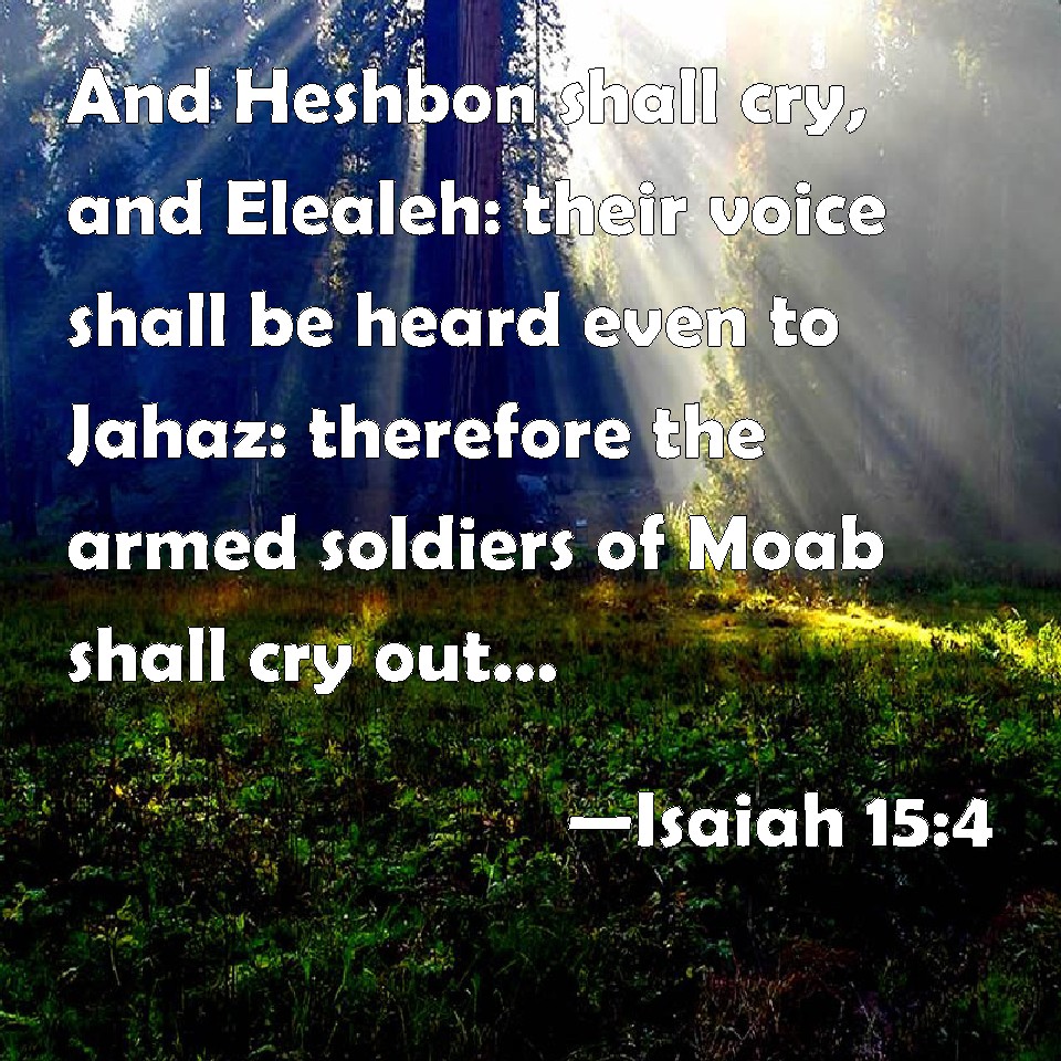 Choose a Background Isaiah 15:4 And Heshbon shall cry, and Elealeh: their voice shall be heard even to Jahaz: therefore the armed soldiers of Moab shall cry out; his life shall be grievous to him. KJV: And Heshbon shall cry, and Elealeh: their voice shall be heard even unto Jahaz: therefore the armed soldiers of Moab shall cry out; his life shall be grievous unto him. DRB: Hesebon shall cry, and Eleale, their voice is heard even to Jasa. For this shall the well appointed men of Moab howl, his soul shall howl to itself. DBT: And Heshbon crieth, and Elealeh: their voice is heard unto Jahaz. Therefore the armed men of Moab cry out: his soul trembleth in him. ERV: And Heshbon crieth out, and Elealeh; their voice is heard even unto Jahaz: therefore the armed men of Moab cry aloud; his soul trembleth within him. WBT: And Heshbon shall cry, and Elealeh: their voice shall be heard even to Jahaz: therefore the armed soldiers of Moab shall cry out; his life shall be grievous to him. WEB: Heshbon cries out with Elealeh. Their voice is heard even to Jahaz. Therefore the armed men of Moab cry aloud. Their souls tremble within them. YLT: And cry doth Heshbon and Elealeh, Unto Jahaz heard hath been their voice, Therefore the armed ones of Moab do shout, His life hath been grievous to him.Links Isaiah 15:4 NIV • Isaiah 15:4 NLT • Isaiah 15:4 ESV • Isaiah 15:4 NASB • Isaiah 15:4 KJV • Isaiah 15:4 Interlinear • Isaiah 15:4 Commentaries • Isaiah 15:4 Parallel Texts • Isaiah 15:4 Bible Apps • Isaiah 15:4 Parallel • Bible Hub |