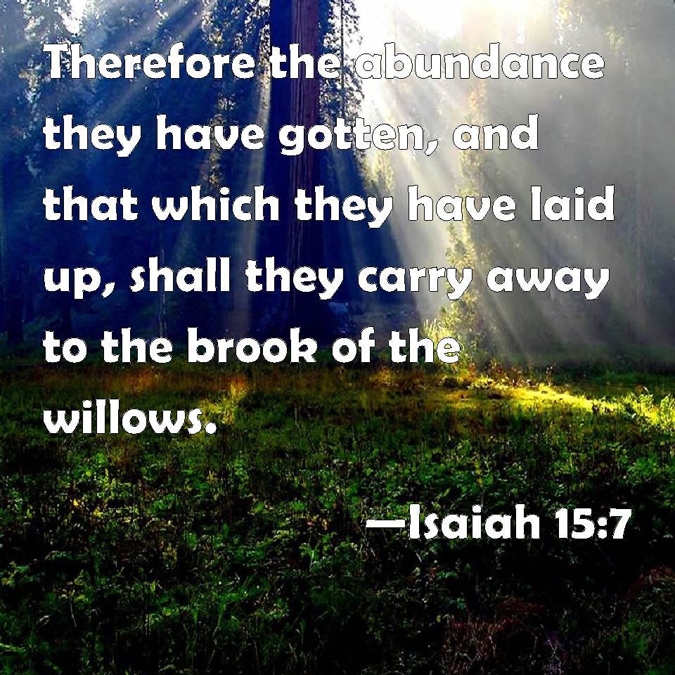 Choose a Background Isaiah 15:7 Therefore the abundance they have gotten, and that which they have laid up, shall they carry away to the brook of the willows. KJV: Therefore the abundance they have gotten, and that which they have laid up, shall they carry away to the brook of the willows. DRB: According to the greatness of their work, is their visitation also: they shall lead them to the torrent of the willows. DBT: Therefore the abundance they have gotten, and that which they have laid up, do they carry away to the torrent of the willows. ERV: Therefore the abundance they have gotten, and that which they have laid up, shall they carry away to the brook of the willows. WBT: Therefore the abundance they have gained, and that which they have laid up, shall they carry away to the brook of the willows. WEB: Therefore they will carry away the abundance they have gotten, and that which they have stored up, over the brook of the willows. YLT: Therefore the abundance he made, and their store, Unto the brook of the willows they carry.Links Isaiah 15:7 NIV • Isaiah 15:7 NLT • Isaiah 15:7 ESV • Isaiah 15:7 NASB • Isaiah 15:7 KJV • Isaiah 15:7 Interlinear • Isaiah 15:7 Commentaries • Isaiah 15:7 Parallel Texts • Isaiah 15:7 Bible Apps • Isaiah 15:7 Parallel • Bible Hub |