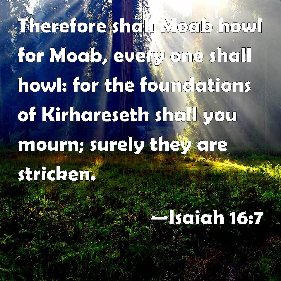 Choose a Background Isaiah 16:7 Therefore shall Moab howl for Moab, every one shall howl: for the foundations of Kirhareseth shall you mourn; surely they are stricken. KJV: Therefore shall Moab howl for Moab, every one shall howl: for the foundations of Kirhareseth shall ye mourn; surely they are stricken. DRB: Therefore shall Moab howl to Moab, every one shall howl: to them that rejoice upon the brick walls, tell ye their stripes. DBT: Therefore shall Moab howl for Moab; every one of them shall howl. For the foundations of Kirhareseth shall ye mourn, verily afflicted. ERV: Therefore shall Moab howl for Moab, every one shall howl: for the raisin-cakes of Kir-hareseth shall ye mourn, utterly stricken. WBT: Therefore shall Moab howl for Moab, every one shall howl: for the foundations of Kir-hareseth shall ye mourn; surely they are stricken. WEB: Therefore Moab will wail for Moab. Everyone will wail. You will mourn for the raisin cakes of Kir Hareseth, utterly stricken. YLT: Therefore howl doth Moab for Moab, all of it doth howl, For the grape-cakes of Kir-Hareseth it meditateth, Surely they are smitten.Links Isaiah 16:7 NIV • Isaiah 16:7 NLT • Isaiah 16:7 ESV • Isaiah 16:7 NASB • Isaiah 16:7 KJV • Isaiah 16:7 Interlinear • Isaiah 16:7 Commentaries • Isaiah 16:7 Parallel Texts • Isaiah 16:7 Bible Apps • Isaiah 16:7 Parallel • Bible Hub |