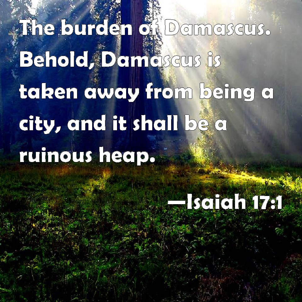 Choose a Background Isaiah 17:1 The burden of Damascus. Behold, Damascus is taken away from being a city, and it shall be a ruinous heap. KJV: The burden of Damascus. Behold, Damascus is taken away from being a city, and it shall be a ruinous heap. DRB: THE burden of Damascus. Behold Damascus shall cease to be a city, and shall be as a ruinous heap of stones. DBT: The burden of Damascus. Behold, Damascus is taken away from being a city, and it shall be a ruinous heap. ERV: The burden of Damascus. Behold, Damascus is taken away from being a city, and it shall be a ruinous heap. WBT: The burden of Damascus. Behold, Damascus is taken away from being a city, and it shall be a ruinous heap. WEB: The burden of Damascus: "Behold, Damascus is taken away from being a city, and it will be a ruinous heap. YLT: The burden of Damascus. Lo, Damascus is taken away from being a city, And it hath been a heap — a ruin.Links Isaiah 17:1 NIV • Isaiah 17:1 NLT • Isaiah 17:1 ESV • Isaiah 17:1 NASB • Isaiah 17:1 KJV • Isaiah 17:1 Interlinear • Isaiah 17:1 Commentaries • Isaiah 17:1 Parallel Texts • Isaiah 17:1 Bible Apps • Isaiah 17:1 Parallel • Bible Hub |