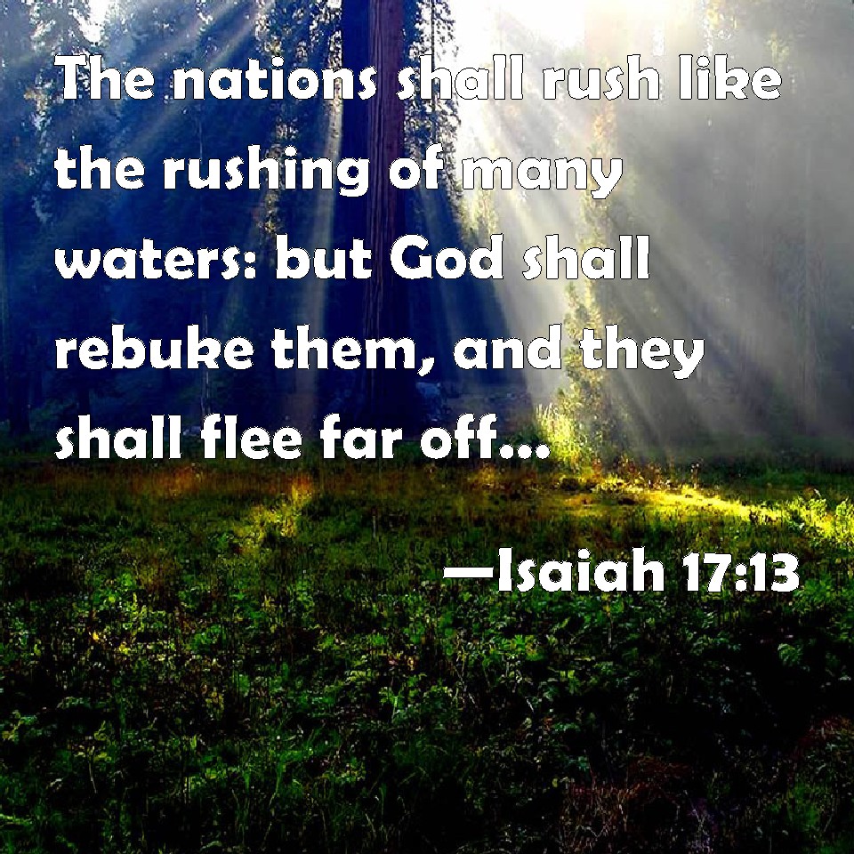 Choose a Background Isaiah 17:13 The nations shall rush like the rushing of many waters: but God shall rebuke them, and they shall flee far off, and shall be chased as the chaff of the mountains before the wind, and like a rolling thing before the whirlwind. KJV: The nations shall rush like the rushing of many waters: but God shall rebuke them, and they shall flee far off, and shall be chased as the chaff of the mountains before the wind, and like a rolling thing before the whirlwind. DRB: Nations shall make a noise like the noise of waters overflowing, but he shall rebuke him, and he shall flee far off: and he shall be carried away as the dust of the mountains before the wind, and as a whirlwind before a tempest. DBT: The nations rush as the rushing of many waters; but he will rebuke them, and they shall flee far away, and shall be chased as the chaff of the mountains before the wind, and like a whirling of dust before the whirlwind: ERV: The nations shall rush like the rushing of many waters: but he shall rebuke them, and they shall flee far off, and shall be chased as the chaff of the mountains before the wind, and like the whirling dust before the storm. WBT: The nations shall rush like the rushing of many waters: but God will rebuke them, and they shall flee far off, and shall be chased as the chaff of the mountains before the wind, and like a rolling thing before the whirlwind. WEB: The nations will rush like the rushing of many waters: but he will rebuke them, and they will flee far off, and will be chased like the chaff of the mountains before the wind, and like the whirling dust before the storm. YLT: Nations as the wasting of many waters are wasted, And He hath pushed against it, And it hath fled afar off, And been pursued as chaff of hills before wind, And as a rolling thing before a hurricane.Links Isaiah 17:13 NIV • Isaiah 17:13 NLT • Isaiah 17:13 ESV • Isaiah 17:13 NASB • Isaiah 17:13 KJV • Isaiah 17:13 Interlinear • Isaiah 17:13 Commentaries • Isaiah 17:13 Parallel Texts • Isaiah 17:13 Bible Apps • Isaiah 17:13 Parallel • Bible Hub |
