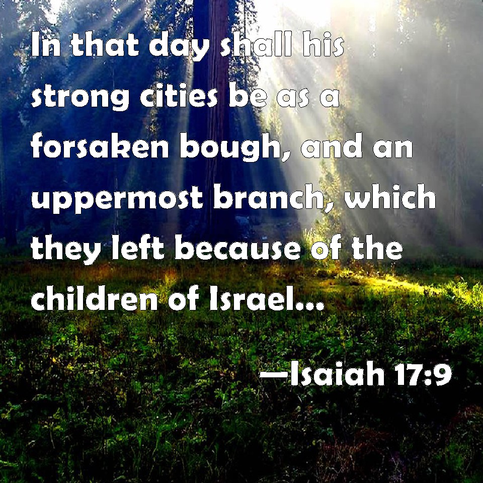 Choose a Background Isaiah 17:9 In that day shall his strong cities be as a forsaken bough, and an uppermost branch, which they left because of the children of Israel: and there shall be desolation. KJV: In that day shall his strong cities be as a forsaken bough, and an uppermost branch, which they left because of the children of Israel: and there shall be desolation. DRB: In that day his strong cities shall be forsaken, as the ploughs, and the corn that were left before the face of the children of Israel, and thou shalt be desolate. DBT: In that day shall his strong cities be as the forsaken tract in the woodland, and the mountain-top which they forsook before the children of Israel; and there shall be desolation. ERV: In that day shall his strong cities be as the forsaken places in the wood and on the mountain top, which were forsaken from before the children of Israel: and it shall be a desolation. WBT: In that day shall his strong cities be as a forsaken bough, and an uppermost branch, which they left because of the children of Israel: and there shall be desolation. WEB: In that day, their strong cities will be like the forsaken places in the woods and on the mountain top, which were forsaken from before the children of Israel; and it will be a desolation. YLT: In that day are the cities of his strength As the forsaken thing of the forest, And the branch that they have left, Because of the sons of Israel, It also hath been a desolation.Links Isaiah 17:9 NIV • Isaiah 17:9 NLT • Isaiah 17:9 ESV • Isaiah 17:9 NASB • Isaiah 17:9 KJV • Isaiah 17:9 Interlinear • Isaiah 17:9 Commentaries • Isaiah 17:9 Parallel Texts • Isaiah 17:9 Bible Apps • Isaiah 17:9 Parallel • Bible Hub |