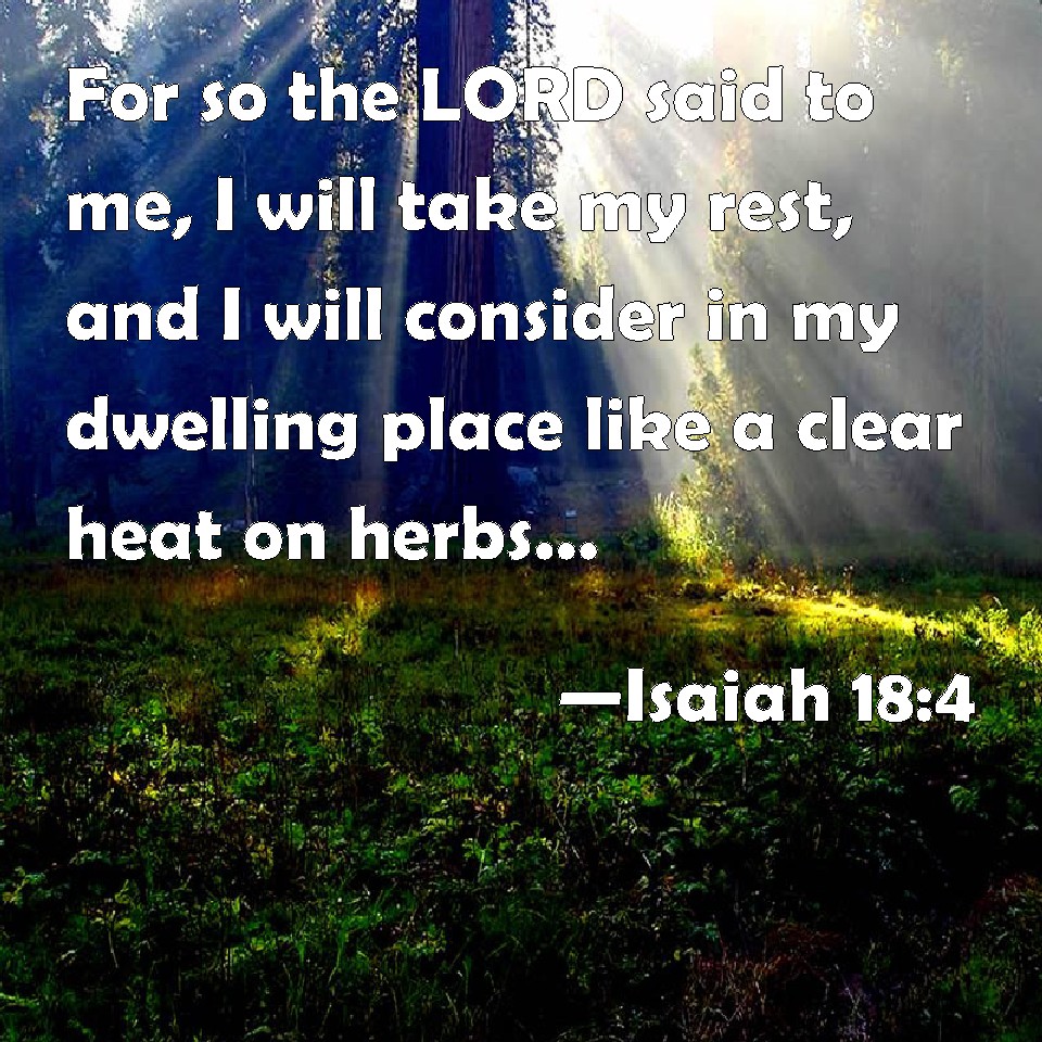 Choose a Background Isaiah 18:4 For so the LORD said to me, I will take my rest, and I will consider in my dwelling place like a clear heat on herbs, and like a cloud of dew in the heat of harvest. KJV: For so the LORD said unto me, I will take my rest, and I will consider in my dwelling place like a clear heat upon herbs, and like a cloud of dew in the heat of harvest. DRB: For thus saith the Lord to me: I will take my rest, and consider in my place, as the noon light is clear, and as a cloud of dew in the day of harvest. DBT: For thus hath Jehovah said unto me: I will take my rest, and I will observe from my dwelling-place like clear heat upon herbs, like a cloud of dew in the heat of harvest. ERV: For thus hath the LORD said unto me, I will be still, and I will behold in my dwelling place; like clear heat in sunshine, like a cloud of dew in the heat of harvest. WBT: For so the LORD said to me, I will take my rest, and I will consider in my dwelling-place like a clear heat upon herbs, and like a cloud of dew in the heat of harvest. WEB: For Yahweh said to me, "I will be still, and I will see in my dwelling place, like clear heat in sunshine, like a cloud of dew in the heat of harvest." YLT: For thus said Jehovah unto me, 'I rest, and I look on My settled place, As a clear heat on an herb. As a thick cloud of dew in the heat of harvest.Links Isaiah 18:4 NIV • Isaiah 18:4 NLT • Isaiah 18:4 ESV • Isaiah 18:4 NASB • Isaiah 18:4 KJV • Isaiah 18:4 Interlinear • Isaiah 18:4 Commentaries • Isaiah 18:4 Parallel Texts • Isaiah 18:4 Bible Apps • Isaiah 18:4 Parallel • Bible Hub |