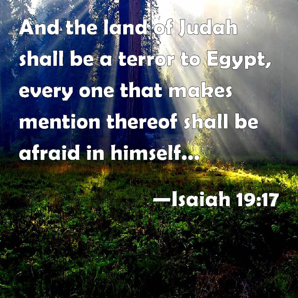 Choose a Background Isaiah 19:17 And the land of Judah shall be a terror to Egypt, every one that makes mention thereof shall be afraid in himself, because of the counsel of the LORD of hosts, which he has determined against it. KJV: And the land of Judah shall be a terror unto Egypt, every one that maketh mention thereof shall be afraid in himself, because of the counsel of the LORD of hosts, which he hath determined against it. DRB: And the land of Juda shall be a terror to Egypt: every one that shall remember it shall tremble because of the counsel of the Lord of hosts, which he hath determined concerning it. DBT: And the land of Judah shall be a dismay unto Egypt: every one that thinketh of it shall be afraid for himself, because of the counsel of Jehovah of hosts, which he hath purposed against it. ERV: And the land of Judah shall become a terror unto Egypt, every one to whom mention is made thereof shall be afraid, because of the purpose of the LORD of hosts, which he purposeth against it. WBT: And the land of Judah shall be a terror to Egypt, every one that maketh mention of it shall be afraid in himself, because of the counsel of the LORD of hosts, which he hath determined against it. WEB: The land of Judah will become a terror to Egypt. Everyone to whom mention is made of it will be afraid, because of the plans of Yahweh of Armies, which he determines against it. YLT: And the land of Judah hath been to Egypt for a cause of staggering, Every one who doth mention it, for himself feareth, Because of the counsel of Jehovah of Hosts, That He is counselling against it.Links Isaiah 19:17 NIV • Isaiah 19:17 NLT • Isaiah 19:17 ESV • Isaiah 19:17 NASB • Isaiah 19:17 KJV • Isaiah 19:17 Interlinear • Isaiah 19:17 Commentaries • Isaiah 19:17 Parallel Texts • Isaiah 19:17 Bible Apps • Isaiah 19:17 Parallel • Bible Hub |