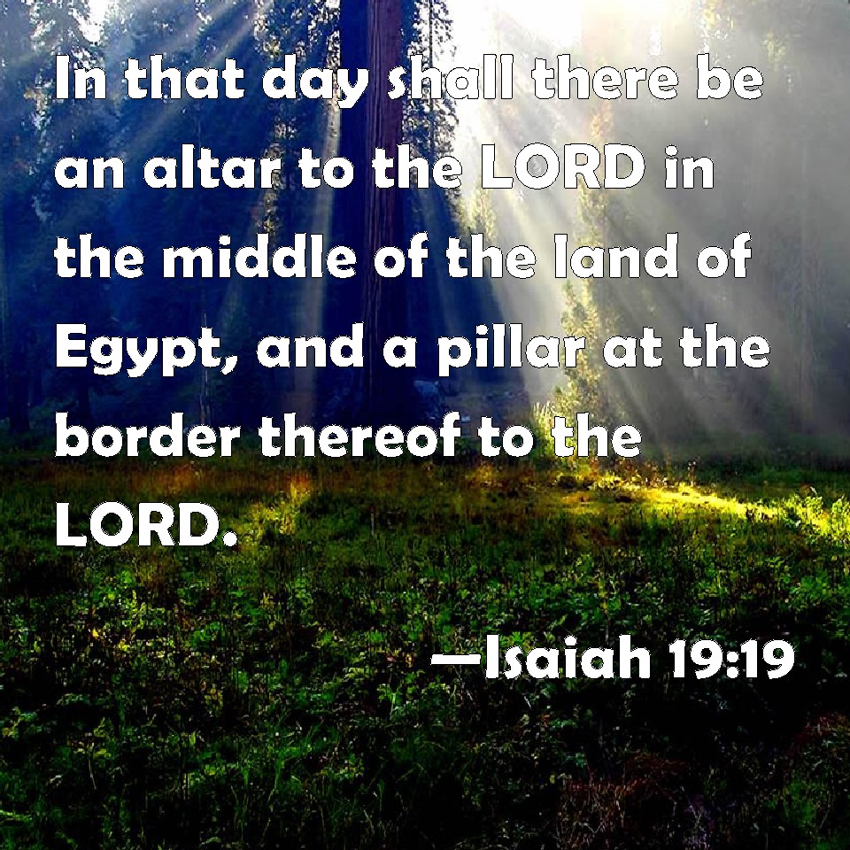 Choose a Background Isaiah 19:19 In that day shall there be an altar to the LORD in the middle of the land of Egypt, and a pillar at the border thereof to the LORD. KJV: In that day shall there be an altar to the LORD in the midst of the land of Egypt, and a pillar at the border thereof to the LORD. DRB: In that day there shall be an altar of the Lord in the midst of the land of Egypt, and a monument of the Lord at the borders thereof: DBT: In that day shall there be an altar to Jehovah in the midst of the land of Egypt, and a pillar at the border thereof to Jehovah: ERV: In that day shall there be an altar to the LORD in the midst of the land of Egypt, and a pillar at the border thereof to the LORD. WBT: In that day shall there be an altar to the LORD in the midst of the land of Egypt, and a pillar at its border to the LORD. WEB: In that day, there will be an altar to Yahweh in the midst of the land of Egypt, and a pillar to Yahweh at its border. YLT: In that day there is an altar to Jehovah In the midst of the land of Egypt, And a standing pillar near its border to Jehovah,Links Isaiah 19:19 NIV • Isaiah 19:19 NLT • Isaiah 19:19 ESV • Isaiah 19:19 NASB • Isaiah 19:19 KJV • Isaiah 19:19 Interlinear • Isaiah 19:19 Commentaries • Isaiah 19:19 Parallel Texts • Isaiah 19:19 Bible Apps • Isaiah 19:19 Parallel • Bible Hub |