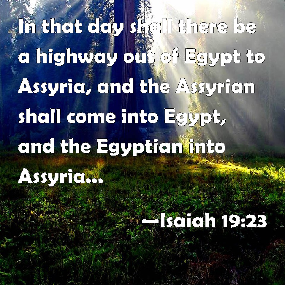 Choose a Background Isaiah 19:23 In that day shall there be a highway out of Egypt to Assyria, and the Assyrian shall come into Egypt, and the Egyptian into Assyria, and the Egyptians shall serve with the Assyrians. KJV: In that day shall there be a highway out of Egypt to Assyria, and the Assyrian shall come into Egypt, and the Egyptian into Assyria, and the Egyptians shall serve with the Assyrians. DRB: In that day there shall be a way from Egypt to the Assyrians, and the Assyrian shall enter into Egypt, and the Egyptian to the Assyrians, and the Egyptians shall serve the Assyrian. DBT: In that day shall there be a highway out of Egypt to Assyria; and the Assyrian shall come into Egypt, and the Egyptian into Assyria; and Egypt shall serve with Assyria. ERV: In that day shall there be a highway out of Egypt to Assyria, and the Assyrian shall come into Egypt, and the Egyptian into Assyria; and the Egyptians shall worship with the Assyrians. WBT: In that day shall there be a highway from Egypt to Assyria, and the Assyrian shall come into Egypt, and the Egyptian into Assyria, and the Egyptians shall serve with the Assyrians. WEB: In that day there will be a highway out of Egypt to Assyria, and the Assyrian shall come into Egypt, and the Egyptian into Assyria; and the Egyptians will worship with the Assyrians. YLT: In that day is a highway out of Egypt to Asshur, And come in have the Assyrians to Egypt, And the Egyptians into Asshur, And the Egyptians have served with the Assyrians.Links Isaiah 19:23 NIV • Isaiah 19:23 NLT • Isaiah 19:23 ESV • Isaiah 19:23 NASB • Isaiah 19:23 KJV • Isaiah 19:23 Interlinear • Isaiah 19:23 Commentaries • Isaiah 19:23 Parallel Texts • Isaiah 19:23 Bible Apps • Isaiah 19:23 Parallel • Bible Hub |