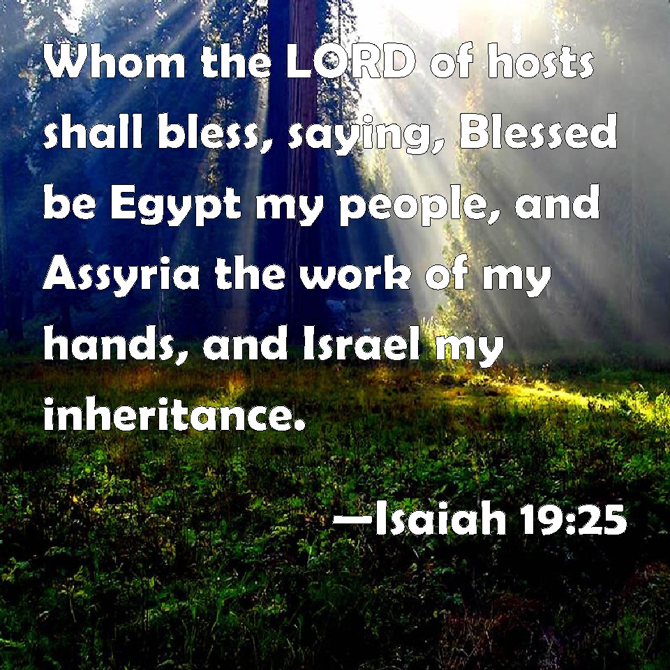 Choose a Background Isaiah 19:25 Whom the LORD of hosts shall bless, saying, Blessed be Egypt my people, and Assyria the work of my hands, and Israel my inheritance. KJV: Whom the LORD of hosts shall bless, saying, Blessed be Egypt my people, and Assyria the work of my hands, and Israel mine inheritance. DRB: Which the Lord of hosts hath blessed, saying: Blessed be my people of Egypt, and the work of my hands to the Assyrian: but Israel is my inheritance. DBT: whom Jehovah of hosts will bless, saying, Blessed be Egypt my people, and Assyria the work of my hands, and Israel mine inheritance! ERV: for that the LORD of hosts hath blessed them, saying, Blessed be Egypt my people, and Assyria the work of my hands, and Israel mine inheritance. WBT: Whom the LORD of hosts will bless, saying, Blessed be Egypt my people, and Assyria the work of my hands, and Israel my inheritance. WEB: because Yahweh of Armies has blessed them, saying, "Blessed be Egypt my people, Assyria the work of my hands, and Israel my inheritance." YLT: In that Jehovah of Hosts did bless it, saying, 'Blessed is My people — Egypt, And the work of My hands — Asshur, And Mine inheritance — Israel!'Links Isaiah 19:25 NIV • Isaiah 19:25 NLT • Isaiah 19:25 ESV • Isaiah 19:25 NASB • Isaiah 19:25 KJV • Isaiah 19:25 Interlinear • Isaiah 19:25 Commentaries • Isaiah 19:25 Parallel Texts • Isaiah 19:25 Bible Apps • Isaiah 19:25 Parallel • Bible Hub |