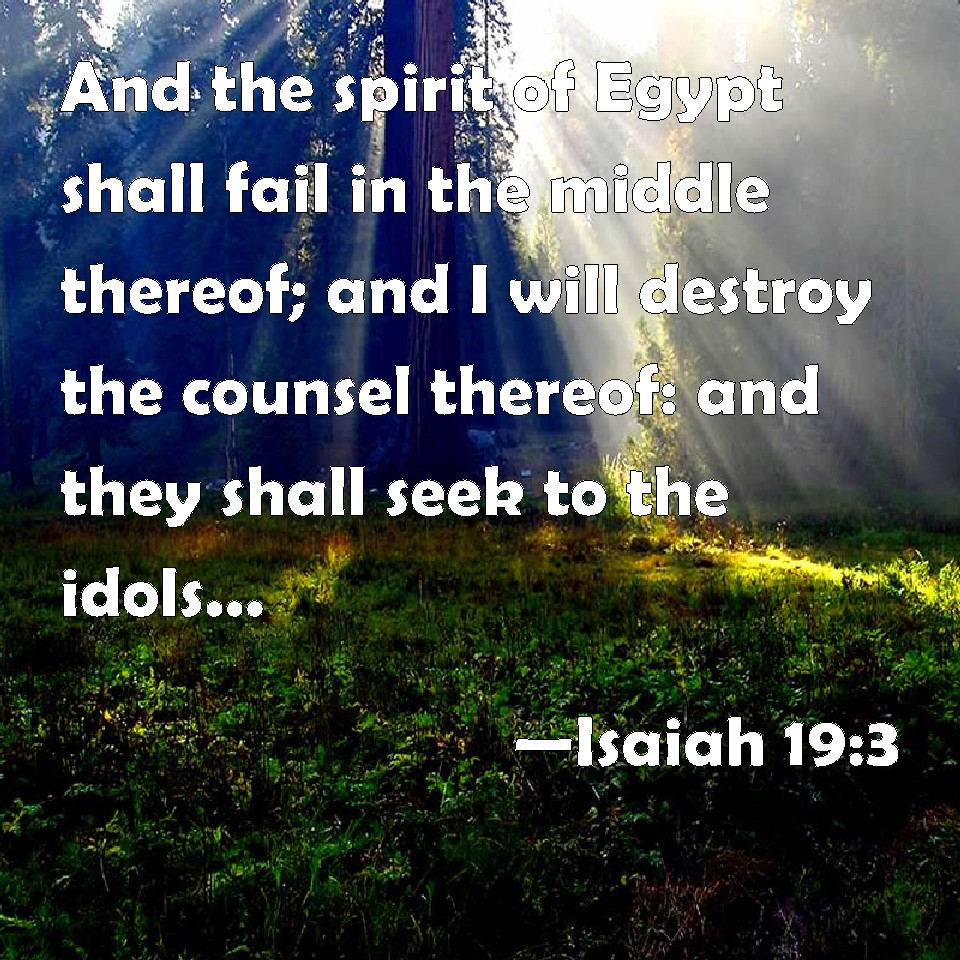 Choose a Background Isaiah 19:3 And the spirit of Egypt shall fail in the middle thereof; and I will destroy the counsel thereof: and they shall seek to the idols, and to the charmers, and to them that have familiar spirits, and to the wizards. KJV: And the spirit of Egypt shall fail in the midst thereof; and I will destroy the counsel thereof: and they shall seek to the idols, and to the charmers, and to them that have familiar spirits, and to the wizards. DRB: And the spirit of Egypt shall be broken in the bowels thereof, and I will cast down their counsel: and they shall consult their idols, and their diviners, and their wizards, and soothsayers. DBT: And the spirit of Egypt shall fail in the midst of it, and I will destroy the counsel thereof; and they shall seek unto the idols and unto the conjurers, and unto the necromancers, and unto the soothsayers. ERV: And the spirit of Egypt shall be made void in the midst of it; and I will destroy the counsel thereof: and they shall seek unto the idols, and to the charmers, and to them that have familiar spirits, and to the wizards. WBT: And the spirit of Egypt shall fail in the midst of her, and I will destroy her counsel: and they shall seek to the idols, and to the charmers, and to them that have familiar spirits, and to the wizards. WEB: The spirit of Egypt will fail in its midst. I will destroy its counsel. They will seek the idols, the charmers, those who have familiar spirits, and the wizards. YLT: And emptied out hath been in its midst the spirit of Egypt. And its counsel I swallow up, And they have sought unto the idols, And unto the charmers, And unto those having familiar spirits, And unto the wizards.Links Isaiah 19:3 NIV • Isaiah 19:3 NLT • Isaiah 19:3 ESV • Isaiah 19:3 NASB • Isaiah 19:3 KJV • Isaiah 19:3 Interlinear • Isaiah 19:3 Commentaries • Isaiah 19:3 Parallel Texts • Isaiah 19:3 Bible Apps • Isaiah 19:3 Parallel • Bible Hub |