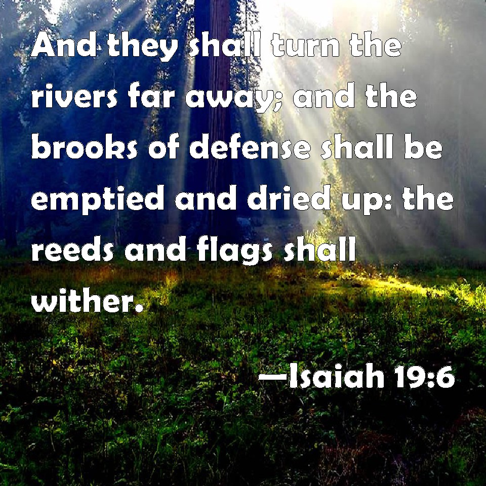 Isaiah 19:6 And they shall turn the rivers far away; and the brooks of defense shall be emptied and dried up: the reeds and flags shall wither.