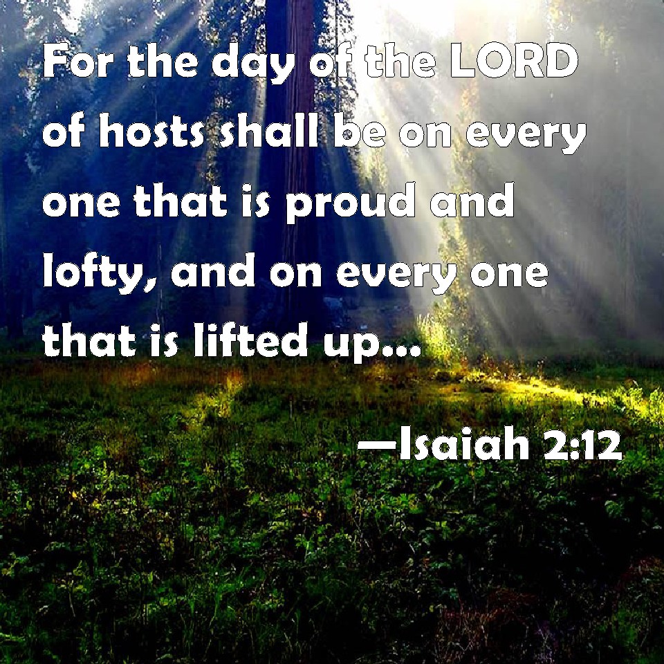 Choose a Background Isaiah 2:12 For the day of the LORD of hosts shall be on every one that is proud and lofty, and on every one that is lifted up; and he shall be brought low: KJV: For the day of the LORD of hosts shall be upon every one that is proud and lofty, and upon every one that is lifted up; and he shall be brought low: DRB: Because the day of the Lord of hosts shall be upon every one that is proud and highminded, and upon every one that is arrogant, and he shall be humbled. DBT: For there shall be a day of Jehovah of hosts upon everything proud and lofty, and upon everything lifted up, and it shall be brought low; ERV: For there shall be a day of the LORD of hosts upon all that is proud and haughty, and upon all that is lifted up; and it shall be brought low: WBT: For the day of the LORD of hosts shall be upon every one that is proud and lofty, and upon every one that is lifted up; and he shall be brought low: WEB: For there will be a day of Yahweh of Armies for all that is proud and haughty, and for all that is lifted up; and it shall be brought low: YLT: For a day is to Jehovah of Hosts, For every proud and high one, And for every lifted up and low one,Links Isaiah 2:12 NIV • Isaiah 2:12 NLT • Isaiah 2:12 ESV • Isaiah 2:12 NASB • Isaiah 2:12 KJV • Isaiah 2:12 Interlinear • Isaiah 2:12 Commentaries • Isaiah 2:12 Parallel Texts • Isaiah 2:12 Bible Apps • Isaiah 2:12 Parallel • Bible Hub |