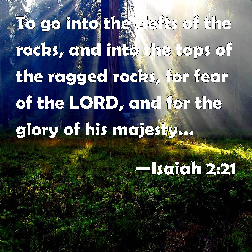 Choose a Background Isaiah 2:21 To go into the clefts of the rocks, and into the tops of the ragged rocks, for fear of the LORD, and for the glory of his majesty, when he rises to shake terribly the earth. KJV: To go into the clefts of the rocks, and into the tops of the ragged rocks, for fear of the LORD, and for the glory of his majesty, when he ariseth to shake terribly the earth. DRB: And he shall go into the clefts of rocks, and into the holes of stones from the face of the fear of the Lord, and from the glory of his majesty, when he shall rise up to strike the earth. DBT: to go into the clefts of the rocks, and into the fissures of the cliffs, from before the terror of Jehovah, and from the glory of his majesty, when he shall arise to terrify the earth. ERV: to go into the caverns of the rocks, and into the clefts of the ragged rocks, from before the terror of the LORD, and from the glory of his majesty, when he ariseth to shake mightily the earth. WBT: To go into the clefts of the rocks, and into the tops of the ragged rocks, for fear of the LORD, and for the glory of his majesty, when he ariseth to shake terribly the earth. WEB: To go into the caverns of the rocks, and into the clefts of the ragged rocks, from before the terror of Yahweh, and from the glory of his majesty, when he arises to shake the earth mightily. YLT: To enter into cavities of the rocks, And into clefts of the high places, Because of the fear of Jehovah, And because of the honour of His excellency, In His rising to terrify the earth.Links Isaiah 2:21 NIV • Isaiah 2:21 NLT • Isaiah 2:21 ESV • Isaiah 2:21 NASB • Isaiah 2:21 KJV • Isaiah 2:21 Interlinear • Isaiah 2:21 Commentaries • Isaiah 2:21 Parallel Texts • Isaiah 2:21 Bible Apps • Isaiah 2:21 Parallel • Bible Hub |