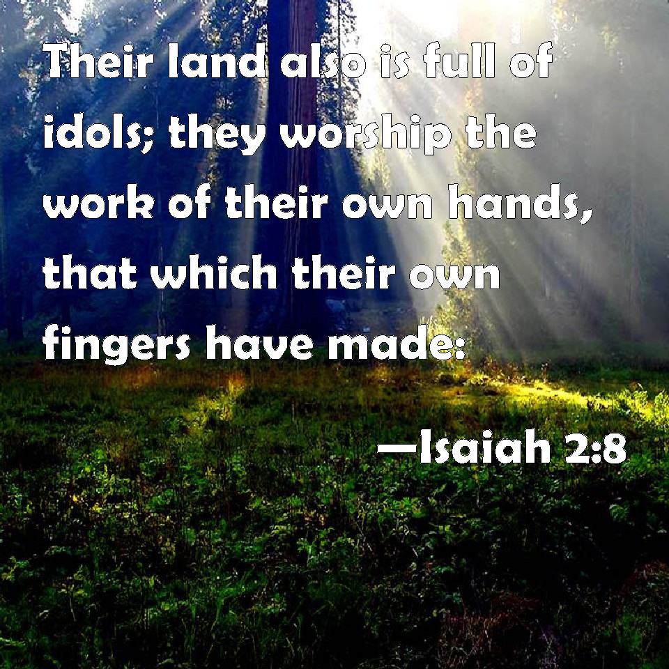 Choose a Background Isaiah 2:8 Their land also is full of idols; they worship the work of their own hands, that which their own fingers have made: KJV: Their land also is full of idols; they worship the work of their own hands, that which their own fingers have made: DRB: And their land is filled with horses: and their chariots are innumerable. Their land also is full of idols: they have adored the work of their own hands, which their own fingers have made. DBT: And their land is full of idols; they bow themselves down to the work of their own hands, to that which their fingers have made. ERV: Their land also is full of idols; they worship the work of their own hands, that which their own fingers have made. WBT: Their land also is full of idols; they worship the work of their own hands, that which their own fingers have made: WEB: Their land also is full of idols. They worship the work of their own hands, that which their own fingers have made. YLT: And its land is full of idols, To the work of its hands it boweth itself, To that which its fingers have made,Links Isaiah 2:8 NIV • Isaiah 2:8 NLT • Isaiah 2:8 ESV • Isaiah 2:8 NASB • Isaiah 2:8 KJV • Isaiah 2:8 Interlinear • Isaiah 2:8 Commentaries • Isaiah 2:8 Parallel Texts • Isaiah 2:8 Bible Apps • Isaiah 2:8 Parallel • Bible Hub |