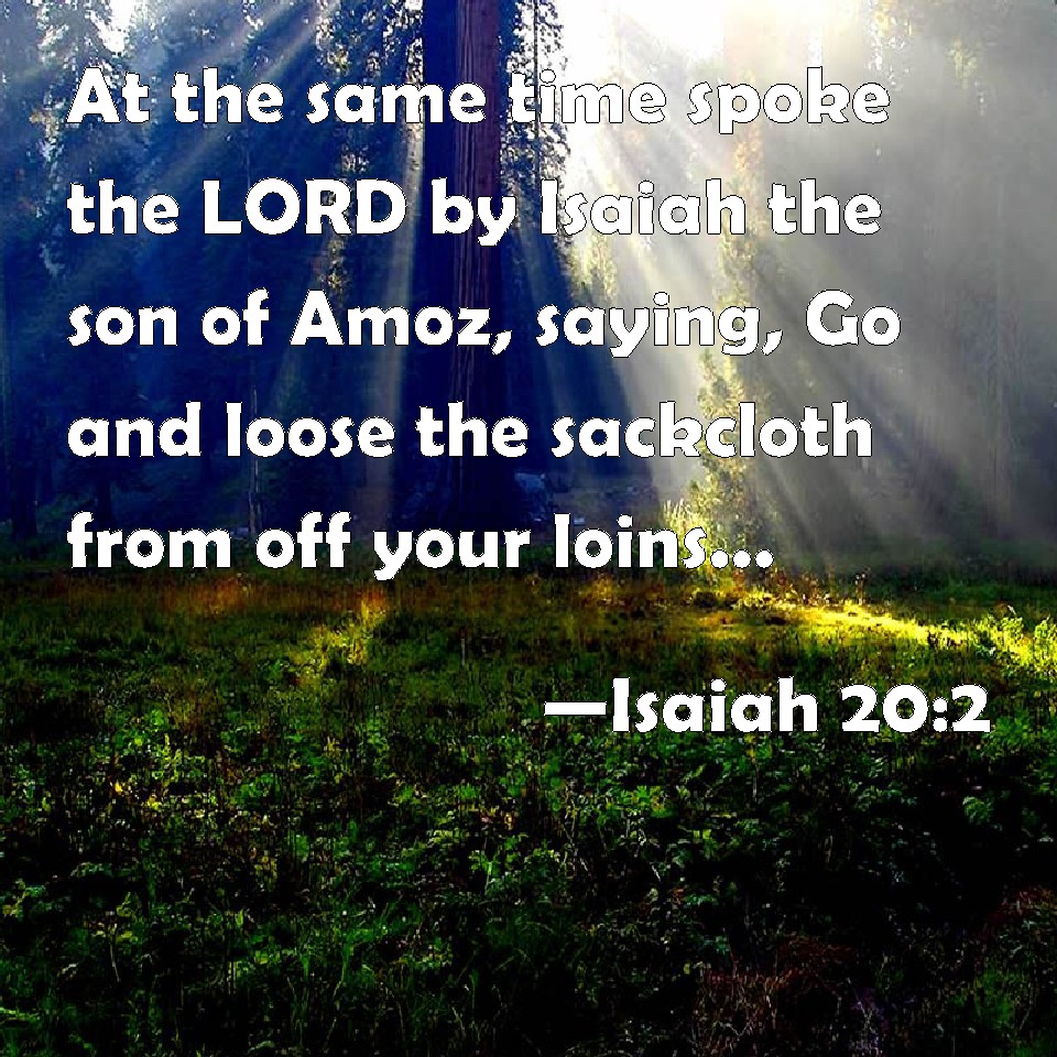 Choose a Background Isaiah 20:2 At the same time spoke the LORD by Isaiah the son of Amoz, saying, Go and loose the sackcloth from off your loins, and put off your shoe from your foot. And he did so, walking naked and barefoot. KJV: At the same time spake the LORD by Isaiah the son of Amoz, saying, Go and loose the sackcloth from off thy loins, and put off thy shoe from thy foot. And he did so, walking naked and barefoot. DRB: At that same time the Lord spoke by the hand of Isaias the son of Amos, saying: Go, and loose the sackcloth from off thy loins, and take off thy shoes from thy feet. And he did so, and went naked, and barefoot. DBT: at that time spoke Jehovah by Isaiah the son of Amoz, saying, Go and loose the sackcloth from off thy loins, and put off thy sandal from thy foot. And he did so, walking naked and barefoot. ERV: at that time the LORD spake by Isaiah the son of Amoz, saying, Go, and loose sackcloth from off thy loins, and put thy shoe from off thy foot. And he did so, walking naked and barefoot. WBT: At the same time spoke the LORD by Isaiah the son of Amoz, saying, Go, and loose the sackcloth from off thy loins, and put off thy shoe from thy foot. And he did so, walking naked and barefoot. WEB: at that time Yahweh spoke by Isaiah the son of Amoz, saying, "Go, and loosen the sackcloth from off your waist, and take your shoes from off your feet." He did so, walking naked and barefoot. YLT: at that time spake Jehovah by the hand of Isaiah son of Amoz, saying, 'Go, and thou hast loosed the sackcloth from off thy loins, and thy sandal thou dost draw from off thy foot,' and he doth so, going naked and barefoot.Links Isaiah 20:2 NIV • Isaiah 20:2 NLT • Isaiah 20:2 ESV • Isaiah 20:2 NASB • Isaiah 20:2 KJV • Isaiah 20:2 Interlinear • Isaiah 20:2 Commentaries • Isaiah 20:2 Parallel Texts • Isaiah 20:2 Bible Apps • Isaiah 20:2 Parallel • Bible Hub |