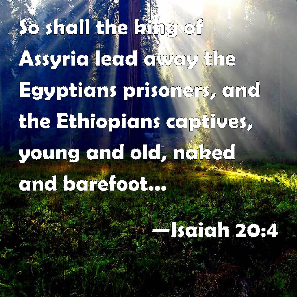 Choose a Background Isaiah 20:4 So shall the king of Assyria lead away the Egyptians prisoners, and the Ethiopians captives, young and old, naked and barefoot, even with their buttocks uncovered, to the shame of Egypt. KJV: So shall the king of Assyria lead away the Egyptians prisoners, and the Ethiopians captives, young and old, naked and barefoot, even with their buttocks uncovered, to the shame of Egypt. DRB: So shall the king of the Assyrians lead away the prisoners of Egypt, and the captivity of Ethiopia, young and old. naked and barefoot, with their buttocks uncovered to the shame of Egypt. DBT: so shall the king of Assyria lead away the captives of Egypt and the exiles of Ethiopia, young and old, naked and barefoot, and with buttocks uncovered, to the shame of Egypt. ERV: so shall the king of Assyria lead away the captives of Egypt, and the exiles of Ethiopia, young and old, naked and barefoot, and with buttocks uncovered, to the shame of Egypt. WBT: So shall the king of Assyria lead away the Egyptians prisoners, and the Cushites captives, young and old, naked and barefoot, even with their hind-parts uncovered, to the shame of Egypt. WEB: so the king of Assyria will lead away the captives of Egypt and the exiles of Ethiopia, young and old, naked and barefoot, and with buttocks uncovered, to the shame of Egypt. YLT: so doth the king of Asshur lead the captivity of Egypt, and the removal of Cush, young and old, naked and barefoot, with seat uncovered — the nakedness of Egypt;Links Isaiah 20:4 NIV • Isaiah 20:4 NLT • Isaiah 20:4 ESV • Isaiah 20:4 NASB • Isaiah 20:4 KJV • Isaiah 20:4 Interlinear • Isaiah 20:4 Commentaries • Isaiah 20:4 Parallel Texts • Isaiah 20:4 Bible Apps • Isaiah 20:4 Parallel • Bible Hub |
