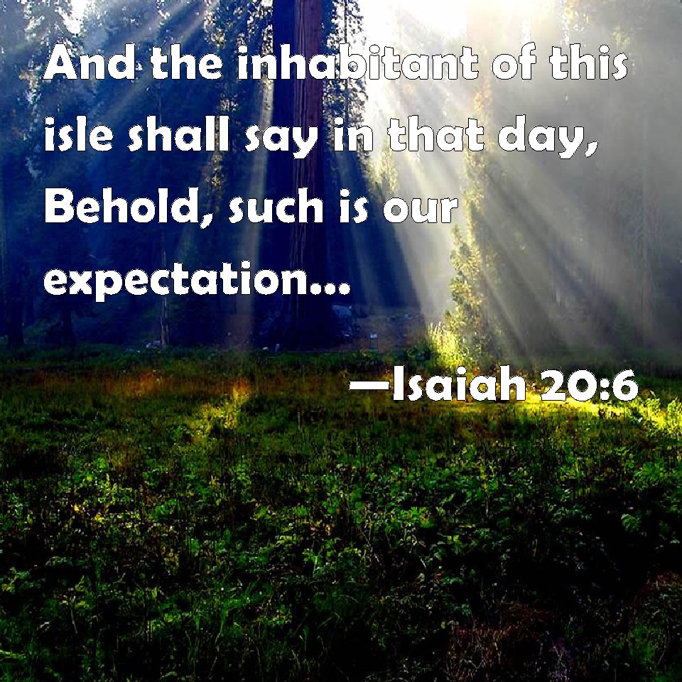 Choose a Background Isaiah 20:6 And the inhabitant of this isle shall say in that day, Behold, such is our expectation, where we flee for help to be delivered from the king of Assyria: and how shall we escape? KJV: And the inhabitant of this isle shall say in that day, Behold, such is our expectation, whither we flee for help to be delivered from the king of Assyria: and how shall we escape? DRB: And the inhabitants of this isle shall say in that day: Lo this was our hope, to whom we fled for help, to deliver up from the face of the king of the Assyrians: and how shall we be able to escape? DBT: And the inhabitants of this coast shall say in that day, Behold, such is our confidence, whither we fled for help to be delivered from the king of Assyria; and how shall we escape? ERV: And the inhabitant of this coastland shall say in that day, Behold, such is our expectation, whither we fled for help to be delivered from the king of Assyria: and we, how shall we escape? WBT: And the inhabitant of this isle shall say in that day, Behold, such is our expectation, whither we flee for help to be delivered from the king of Assyria: and how shall we escape? WEB: The inhabitants of this coast land will say in that day, 'Behold, this is our expectation, where we fled for help to be delivered from the king of Assyria. And we, how will we escape?'" YLT: and the inhabitant of this isle hath said in that day — Lo, thus is our trust, Whither we have fled for help, To be delivered from the king of Asshur, And how do we escape — we?'Links Isaiah 20:6 NIV • Isaiah 20:6 NLT • Isaiah 20:6 ESV • Isaiah 20:6 NASB • Isaiah 20:6 KJV • Isaiah 20:6 Interlinear • Isaiah 20:6 Commentaries • Isaiah 20:6 Parallel Texts • Isaiah 20:6 Bible Apps • Isaiah 20:6 Parallel • Bible Hub |