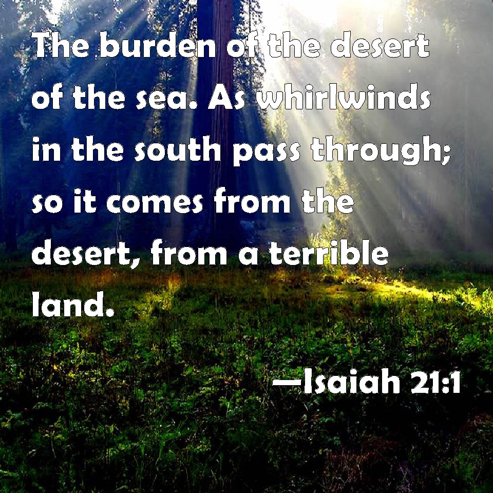 Choose a Background Isaiah 21:1 The burden of the desert of the sea. As whirlwinds in the south pass through; so it comes from the desert, from a terrible land. KJV: The burden of the desert of the sea. As whirlwinds in the south pass through; so it cometh from the desert, from a terrible land. DRB: THE burden of the desert of the sea. As whirlwinds come from the south, it cometh from the desert from a terrible land. DBT: The burden of the desert of the sea. As whirlwinds in the south pass through, so it cometh from the desert, from a terrible land. ERV: The burden of the wilderness of the sea. As whirlwinds in the South sweep through, it cometh from the wilderness, from a terrible land. WBT: The burden of the desert of the sea. As whirlwinds in the south pass through; so it cometh from the desert, from a terrible land. WEB: The burden of the wilderness of the sea. As whirlwinds in the South sweep through, it comes from the wilderness, from an awesome land. YLT: The burden of the wilderness of the sea. 'Like hurricanes in the south for passing through, From the wilderness it hath come, From a fearful land.Links Isaiah 21:1 NIV • Isaiah 21:1 NLT • Isaiah 21:1 ESV • Isaiah 21:1 NASB • Isaiah 21:1 KJV • Isaiah 21:1 Interlinear • Isaiah 21:1 Commentaries • Isaiah 21:1 Parallel Texts • Isaiah 21:1 Bible Apps • Isaiah 21:1 Parallel • Bible Hub |