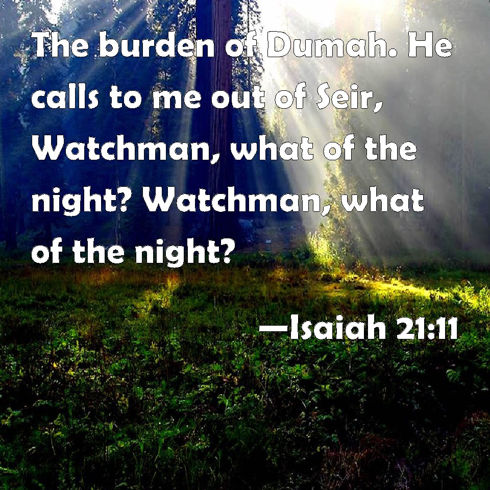 Choose a Background Isaiah 21:11 The burden of Dumah. He calls to me out of Seir, Watchman, what of the night? Watchman, what of the night? KJV: The burden of Dumah. He calleth to me out of Seir, Watchman, what of the night? Watchman, what of the night? DRB: The burden of Duma calleth to me out of Seir: Watchman, what of the eight? watchman, what of the night? DBT: The burden of Dumah. He calleth to me out of Seir, Watchman, what of the night? Watchman, what of the night? ERV: The burden of Dumah. One calleth unto me out of Seir, Watchman, what of the night? Watchman, what of the night? WBT: The burden of Dumah. He calleth to me out of Seir, Watchman, what of the night? Watchman, what of the night? WEB: The burden of Dumah. One calls to me out of Seir, "Watchman, what of the night? Watchman, what of the night?" YLT: The burden of Dumah. Unto me is one calling from Seir 'Watchman, what of the night? Watchman, what of the night?'Links Isaiah 21:11 NIV • Isaiah 21:11 NLT • Isaiah 21:11 ESV • Isaiah 21:11 NASB • Isaiah 21:11 KJV • Isaiah 21:11 Interlinear • Isaiah 21:11 Commentaries • Isaiah 21:11 Parallel Texts • Isaiah 21:11 Bible Apps • Isaiah 21:11 Parallel • Bible Hub |