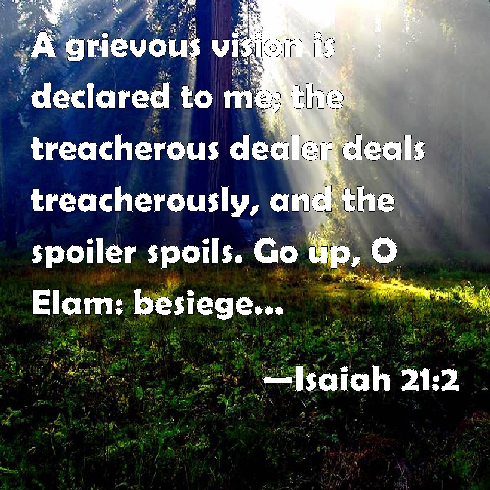 Choose a Background Isaiah 21:2 A grievous vision is declared to me; the treacherous dealer deals treacherously, and the spoiler spoils. Go up, O Elam: besiege, O Media; all the sighing thereof have I made to cease. KJV: A grievous vision is declared unto me; the treacherous dealer dealeth treacherously, and the spoiler spoileth. Go up, O Elam: besiege, O Media; all the sighing thereof have I made to cease. DRB: A grievous vision is told me: he that is unfaithful dealeth unfaithfully : and he that is a spoiler, spoileth. Go up, O Elam, besiege, O Mede: I have made all the mourning thereof to cease. DBT: A grievous vision is declared unto me: the treacherous dealeth treacherously, and the spoiler spoileth. Go up, Elam! besiege, Media! All the sighing thereof have I made to cease. ERV: A grievous vision is declared unto me; the treacherous dealer dealeth treacherously, and the spoiler spoileth. Go up, O Elam; besiege, O Media; all the sighing thereof have I made to cease. WBT: A grievous vision is declared to me; the treacherous dealer dealeth treacherously, and the spoiler plundereth. Go up, O Elam: besiege, O Media; all her sighing have I made to cease. WEB: A grievous vision is declared to me. The treacherous man deals treacherously, and the destroyer destroys. Go up, Elam; attack! I have stopped all of Media's sighing. YLT: A hard vision hath been declared to me, The treacherous dealer is dealing treacherously, And the destroyer is destroying. Go up, O Elam, besiege, O Media, All its sighing I have caused to cease.Links Isaiah 21:2 NIV • Isaiah 21:2 NLT • Isaiah 21:2 ESV • Isaiah 21:2 NASB • Isaiah 21:2 KJV • Isaiah 21:2 Interlinear • Isaiah 21:2 Commentaries • Isaiah 21:2 Parallel Texts • Isaiah 21:2 Bible Apps • Isaiah 21:2 Parallel • Bible Hub |