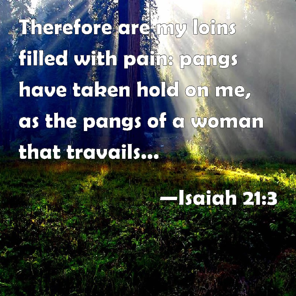 Choose a Background Isaiah 21:3 Therefore are my loins filled with pain: pangs have taken hold on me, as the pangs of a woman that travails: I was bowed down at the hearing of it; I was dismayed at the seeing of it. KJV: Therefore are my loins filled with pain: pangs have taken hold upon me, as the pangs of a woman that travaileth: I was bowed down at the hearing of it; I was dismayed at the seeing of it. DRB: Therefore are my loins filled with pain, anguish hath taken hold of me, as the anguish of a woman in labour: I fell down at the hearing of it, I was troubled at the seeing of it. DBT: Therefore are my loins filled with pain; anguish hath taken hold upon me, as the anguish of a woman in travail: I am bowed down so as not to hear, I am dismayed so as not to see. ERV: Therefore are my loins filled with anguish; pangs have taken hold upon me, as the pangs of a woman in travail: I am pained so that I cannot hear; I am dismayed so that I cannot see. WBT: Therefore are my loins filled with pain: pangs have taken hold upon me, as the pangs of a woman that travaileth: I was bowed down at the hearing of it; I was dismayed at the seeing of it. WEB: Therefore my thighs are filled with anguish. Pains have taken hold on me, like the pains of a woman in labor. I am in so much pain that I can't hear. I so am dismayed that I can't see. YLT: Therefore filled have been my loins with great pain, Pangs have seized me as pangs of a travailing woman, I have been bent down by hearing, I have been troubled by seeing.Links Isaiah 21:3 NIV • Isaiah 21:3 NLT • Isaiah 21:3 ESV • Isaiah 21:3 NASB • Isaiah 21:3 KJV • Isaiah 21:3 Interlinear • Isaiah 21:3 Commentaries • Isaiah 21:3 Parallel Texts • Isaiah 21:3 Bible Apps • Isaiah 21:3 Parallel • Bible Hub |