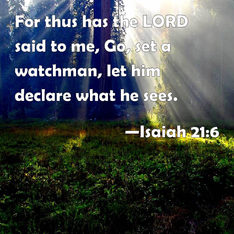 Choose a Background Isaiah 21:6 For thus has the LORD said to me, Go, set a watchman, let him declare what he sees. KJV: For thus hath the Lord said unto me, Go, set a watchman, let him declare what he seeth. DRB: For thus hath the Lord said to me: Go, and set a watchman: and whatsoever he shall see, let him tell. DBT: For thus hath the Lord said unto me: Go, set a watchman, let him declare what he seeth. ERV: For thus hath the Lord said unto me, Go, set a watchman; let him declare what he seeth: WBT: For thus hath the Lord said to me, Go, set a watchman, let him declare what he seeth. WEB: For the Lord said to me, "Go, set a watchman. Let him declare what he sees. YLT: For thus said the Lord unto me: 'Go, station the watchman, That which he seeth let him declare.'Links Isaiah 21:6 NIV • Isaiah 21:6 NLT • Isaiah 21:6 ESV • Isaiah 21:6 NASB • Isaiah 21:6 KJV • Isaiah 21:6 Interlinear • Isaiah 21:6 Commentaries • Isaiah 21:6 Parallel Texts • Isaiah 21:6 Bible Apps • Isaiah 21:6 Parallel • Bible Hub |