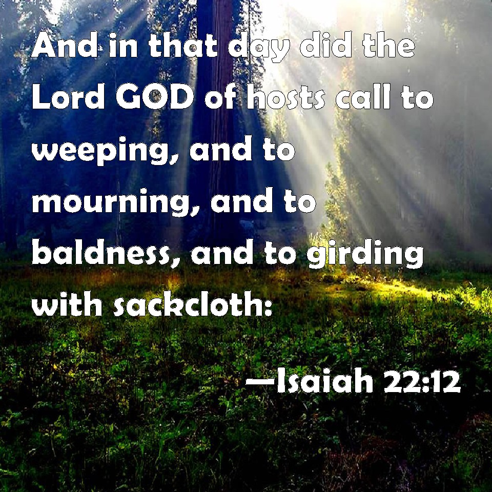 Choose a Background Isaiah 22:12 And in that day did the Lord GOD of hosts call to weeping, and to mourning, and to baldness, and to girding with sackcloth: KJV: And in that day did the Lord GOD of hosts call to weeping, and to mourning, and to baldness, and to girding with sackcloth: DRB: And the Lord, the God of hosts, in that day shall call to weeping, and to mourning, to baldness, and to girding with sackcloth: DBT: And in that day did the Lord Jehovah of hosts call to weeping, and to mourning, and to baldness, and to girding with sackcloth; ERV: And in that day did the Lord, the LORD of hosts, call to weeping, and to mourning, and to baldness, and to girding with sackcloth: WBT: And in that day did the Lord GOD of hosts call to weeping, and to mourning, and to baldness, and to girding with sackcloth: WEB: In that day, the Lord, Yahweh of Armies, called to weeping, and to mourning, and to baldness, and to dressing in sackcloth: YLT: And call doth the Lord, Jehovah of Hosts, In that day, to weeping and to lamentation, And to baldness and to girding on of sackcloth,Links Isaiah 22:12 NIV • Isaiah 22:12 NLT • Isaiah 22:12 ESV • Isaiah 22:12 NASB • Isaiah 22:12 KJV • Isaiah 22:12 Interlinear • Isaiah 22:12 Commentaries • Isaiah 22:12 Parallel Texts • Isaiah 22:12 Bible Apps • Isaiah 22:12 Parallel • Bible Hub |