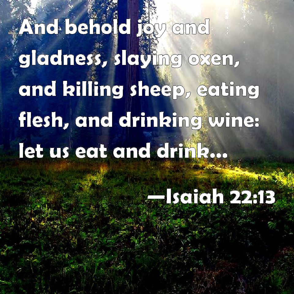 Choose a Background Isaiah 22:13 And behold joy and gladness, slaying oxen, and killing sheep, eating flesh, and drinking wine: let us eat and drink; for to morrow we shall die. KJV: And behold joy and gladness, slaying oxen, and killing sheep, eating flesh, and drinking wine: let us eat and drink; for to morrow we shall die. DRB: And behold joy and gladness, killing calves, and slaying rams, eating flesh, and drinking wine: Let us eat and drink; for to morrow we shall die. DBT: and behold joy and rejoicing, slaying oxen, and killing sheep, eating flesh, and drinking wine: Let us eat and drink, for to-morrow we die. ERV: and behold, joy and gladness, slaying oxen and killing sheep, eating flesh and drinking wine: let us eat and drink, for tomorrow we shall die. WBT: And behold joy and gladness, slaying oxen, and killing sheep, eating flesh, and drinking wine: let us eat and drink; for to-morrow we shall die. WEB: and behold, joy and gladness, killing cattle and killing sheep, eating flesh and drinking wine: "Let us eat and drink, for tomorrow we will die." YLT: And lo, joy and gladness, slaying of oxen, And slaughtering of sheep, Eating of flesh, and drinking of wine, Eat and drink, for to-morrow we die.Links Isaiah 22:13 NIV • Isaiah 22:13 NLT • Isaiah 22:13 ESV • Isaiah 22:13 NASB • Isaiah 22:13 KJV • Isaiah 22:13 Interlinear • Isaiah 22:13 Commentaries • Isaiah 22:13 Parallel Texts • Isaiah 22:13 Bible Apps • Isaiah 22:13 Parallel • Bible Hub |