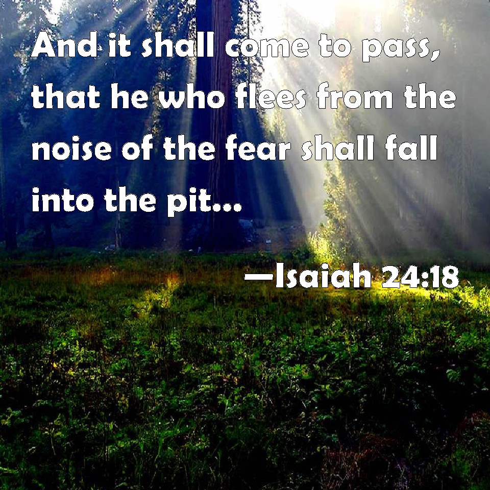 Choose a Background Isaiah 24:18 And it shall come to pass, that he who flees from the noise of the fear shall fall into the pit; and he that comes up out of the middle of the pit shall be taken in the snare: for the windows from on high are open, and the foundations of the earth do shake. KJV: And it shall come to pass, that he who fleeth from the noise of the fear shall fall into the pit; and he that cometh up out of the midst of the pit shall be taken in the snare: for the windows from on high are open, and the foundations of the earth do shake. DRB: And it shall come to pass, that he that shall flee from the noise of the fear, shall fall into the pit: and he that shall rid himself out of the pit, shall be taken in the snare: for the flood-gates from on high are opened, and the foundations of the earth shall be shaken. DBT: And it shall come to pass, that he who fleeth from the sound of the fear shall fall into the pit; and he that cometh up out of the midst of the pit shall be taken in the snare; for the windows on high are open, and the foundations of the earth shake. ERV: And it shall come to pass, that he who fleeth from the noise of the fear shall fall into the pit; and he that cometh up out of the midst of the pit shall be taken in the snare: for the windows on high are opened, and the foundations of the earth do shake. WBT: And it shall come to pass, that he who fleeth from the noise of the fear shall fall into the pit; and he that cometh up out of the midst of the pit shall be taken in the snare: for the windows from on high are open, and the foundations of the earth do shake. WEB: It will happen that he who flees from the noise of the fear will fall into the pit; and he who comes up out of the midst of the pit will be taken in the snare; for the windows on high are opened, and the foundations of the earth tremble. YLT: And it hath come to pass, He who is fleeing from the noise of the fear Doth fall into the snare, And he who is coming up from the midst of the snare, Is captured by the gin, For windows on high have been opened, And shaken are foundations of the land.Links Isaiah 24:18 NIV • Isaiah 24:18 NLT • Isaiah 24:18 ESV • Isaiah 24:18 NASB • Isaiah 24:18 KJV • Isaiah 24:18 Interlinear • Isaiah 24:18 Commentaries • Isaiah 24:18 Parallel Texts • Isaiah 24:18 Bible Apps • Isaiah 24:18 Parallel • Bible Hub |
