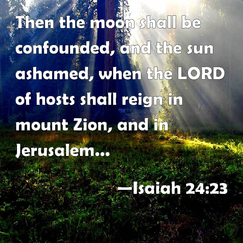 Choose a Background Isaiah 24:23 Then the moon shall be confounded, and the sun ashamed, when the LORD of hosts shall reign in mount Zion, and in Jerusalem, and before his ancients gloriously. KJV: Then the moon shall be confounded, and the sun ashamed, when the LORD of hosts shall reign in mount Zion, and in Jerusalem, and before his ancients gloriously. DRB: fend the moon shall blush, and the sun shall be ashamed, when the Lord of hosts shall reign in mount Sion, and in Jerusalem, and shall be glorified in the sight of his ancients. DBT: And the moon shall be confounded, and the sun ashamed; for Jehovah of hosts shall reign on mount Zion, and in Jerusalem, and before his ancients in glory. ERV: Then the moon shall be confounded, and the sun ashamed; for the LORD of hosts shall reign in mount Zion, and in Jerusalem, and before his ancients gloriously. WBT: Then the moon shall be confounded, and the sun ashamed, when the LORD of hosts shall reign on mount Zion, and in Jerusalem, and before his ancients gloriously. WEB: Then the moon shall be confounded, and the sun ashamed; for Yahweh of Armies will reign on Mount Zion, and in Jerusalem; and before his elders will be glory. YLT: And confounded hath been the moon, And ashamed hath been the sun, For reigned hath Jehovah of Hosts In mount Zion, and in Jerusalem, And over-against His elders — honour!Links Isaiah 24:23 NIV • Isaiah 24:23 NLT • Isaiah 24:23 ESV • Isaiah 24:23 NASB • Isaiah 24:23 KJV • Isaiah 24:23 Interlinear • Isaiah 24:23 Commentaries • Isaiah 24:23 Parallel Texts • Isaiah 24:23 Bible Apps • Isaiah 24:23 Parallel • Bible Hub |