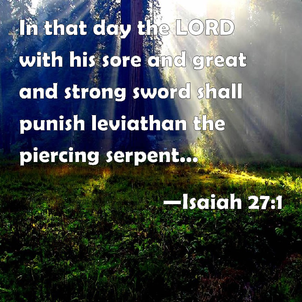 Choose a Background Isaiah 27:1 In that day the LORD with his sore and great and strong sword shall punish leviathan the piercing serpent, even leviathan that crooked serpent; and he shall slay the dragon that is in the sea. KJV: In that day the LORD with his sore and great and strong sword shall punish leviathan the piercing serpent, even leviathan that crooked serpent; and he shall slay the dragon that is in the sea. DRB: IN that day the Lord with his hard, and great, and strong sword shall visit leviathan the bar serpent, and leviathan the crooked serpent, and shall slay the whale that is in the see. DBT: In that day Jehovah, with his sore and great and strong sword, will visit leviathan the fleeing serpent, and leviathan the crooked serpent; and he will slay the monster that is in the sea. ERV: In that day the LORD with his sore and great and strong sword shall punish leviathan the swift serpent, and leviathan the crooked serpent; and he shall slay the dragon that is in the sea. WBT: In that day the LORD with his keen and great and strong sword will punish leviathan the piercing serpent, even leviathan that crooked serpent; and he will slay the dragon that is in the sea. WEB: In that day, Yahweh with his hard and great and strong sword will punish leviathan, the fleeing serpent, and leviathan the twisted serpent; and he will kill the dragon that is in the sea. YLT: In that day lay a charge doth Jehovah, With his sword — the sharp, and the great, and the strong, On leviathan — a fleeing serpent, And on leviathan — a crooked serpent, And He hath slain the dragon that is in the sea.Links Isaiah 27:1 NIV • Isaiah 27:1 NLT • Isaiah 27:1 ESV • Isaiah 27:1 NASB • Isaiah 27:1 KJV • Isaiah 27:1 Interlinear • Isaiah 27:1 Commentaries • Isaiah 27:1 Parallel Texts • Isaiah 27:1 Bible Apps • Isaiah 27:1 Parallel • Bible Hub |