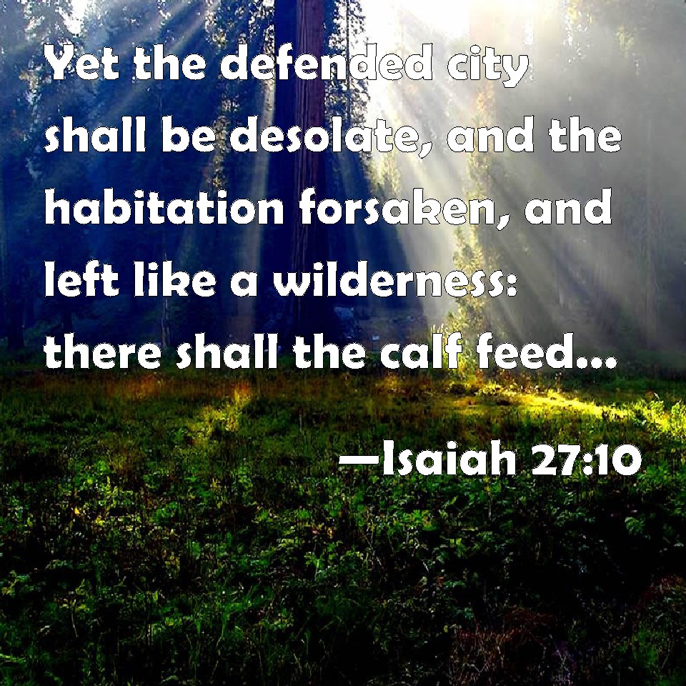 Choose a Background Isaiah 27:10 Yet the defended city shall be desolate, and the habitation forsaken, and left like a wilderness: there shall the calf feed, and there shall he lie down, and consume the branches thereof. KJV: Yet the defenced city shall be desolate, and the habitation forsaken, and left like a wilderness: there shall the calf feed, and there shall he lie down, and consume the branches thereof. DRB: For the strong city shall be desolate, the beautiful city shall be forsaken, and shall be left as a wilderness : there the calf shall feed, and there shall he lie down, and shall consume its branches. DBT: For the fortified city is solitary, a habitation abandoned and forsaken like a wilderness; there shall the calf feed, and there shall he lie down, and consume its boughs. ERV: For the defenced city is solitary, an habitation deserted and forsaken, like the wilderness: there shall the calf feed, and there shall he lie down, and consume the branches thereof. WBT: Yet the fortified city shall be desolate, and the habitation forsaken, and left like a wilderness: there shall the calf feed, and there shall he lie down, and consume its branches. WEB: For the fortified city is solitary, a habitation deserted and forsaken, like the wilderness. The calf will feed there, and there he will lie down, and consume its branches. YLT: For the fenced city is alone, A habitation cast out and forsaken as a wilderness, There doth the calf delight, And there it lieth down, And hath consumed its branches.Links Isaiah 27:10 NIV • Isaiah 27:10 NLT • Isaiah 27:10 ESV • Isaiah 27:10 NASB • Isaiah 27:10 KJV • Isaiah 27:10 Interlinear • Isaiah 27:10 Commentaries • Isaiah 27:10 Parallel Texts • Isaiah 27:10 Bible Apps • Isaiah 27:10 Parallel • Bible Hub |