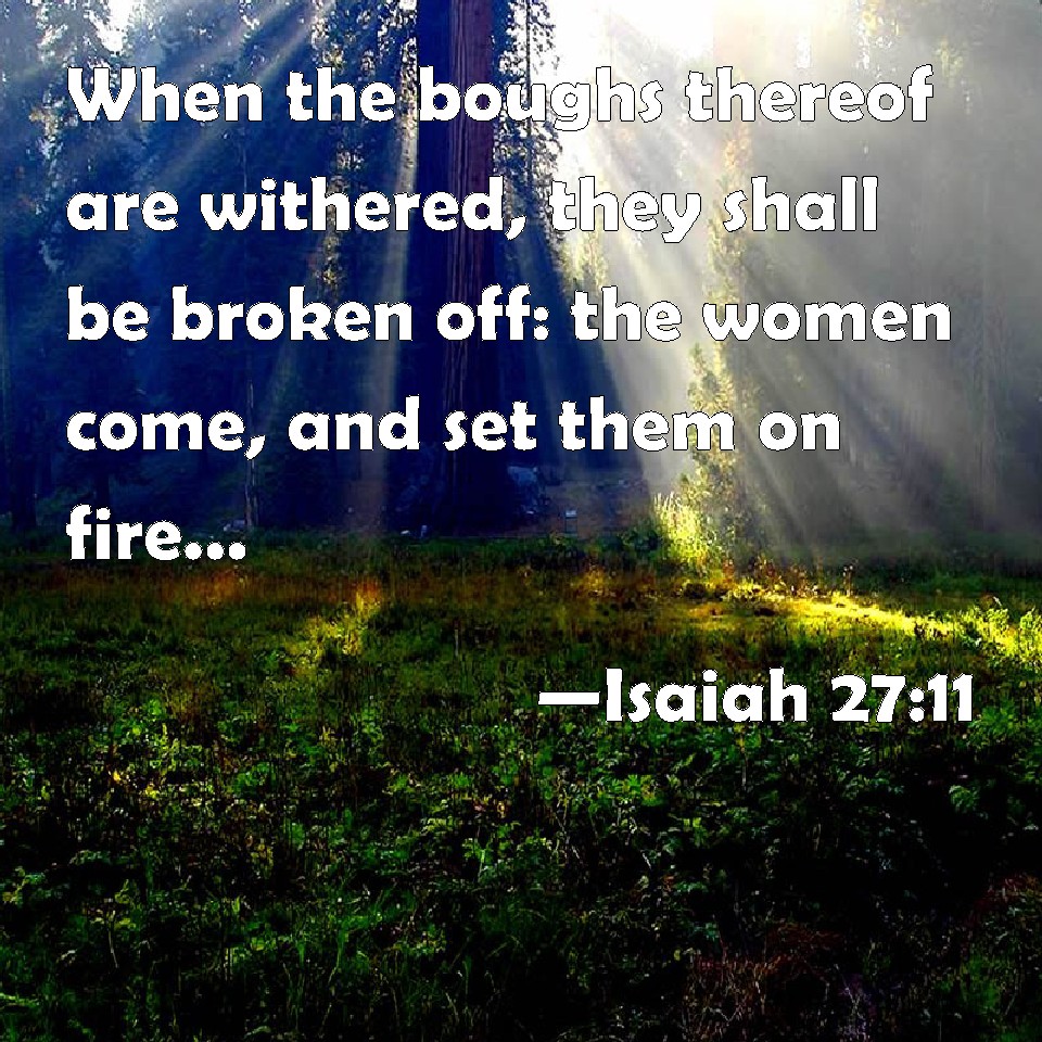Choose a Background Isaiah 27:11 When the boughs thereof are withered, they shall be broken off: the women come, and set them on fire: for it is a people of no understanding: therefore he that made them will not have mercy on them, and he that formed them will show them no favor. KJV: When the boughs thereof are withered, they shall be broken off: the women come, and set them on fire: for it is a people of no understanding: therefore he that made them will not have mercy on them, and he that formed them will shew them no favour. DRB: Its harvest shall be destroyed with drought, women shall come and teach it: for it is not a wise people, therefore he that made it, shall not have mercy on it: and he that formed it, shall not spare it. DBT: When its branches are withered they shall be broken off; women shall come and set them on fire. For it is a people of no intelligence; therefore he that made them will not have mercy on them, and he who formed them will shew them no favour. ERV: When the boughs thereof are withered, they shall be broken off; the women shall come, and set them on fire: for it is a people of no understanding; therefore he that made them will not have compassion upon them, and he that formed them will shew them no favour. WBT: When its boughs are withered, they shall be broken off: the women come and set them on fire: for it is a people of no understanding: therefore he that made them will not have mercy on them, and he that formed them will show them no favor. WEB: When its boughs are withered, they will be broken off. The women will come and set them on fire, for they are a people of no understanding. Therefore he who made them will not have compassion on them, and he who formed them will show them no favor. YLT: In the withering of its branch it is broken off, Women are coming in setting it on fire, For it is not a people of understanding, Therefore pity it not doth its Maker, And its Former doth not favour it.Links Isaiah 27:11 NIV • Isaiah 27:11 NLT • Isaiah 27:11 ESV • Isaiah 27:11 NASB • Isaiah 27:11 KJV • Isaiah 27:11 Interlinear • Isaiah 27:11 Commentaries • Isaiah 27:11 Parallel Texts • Isaiah 27:11 Bible Apps • Isaiah 27:11 Parallel • Bible Hub |