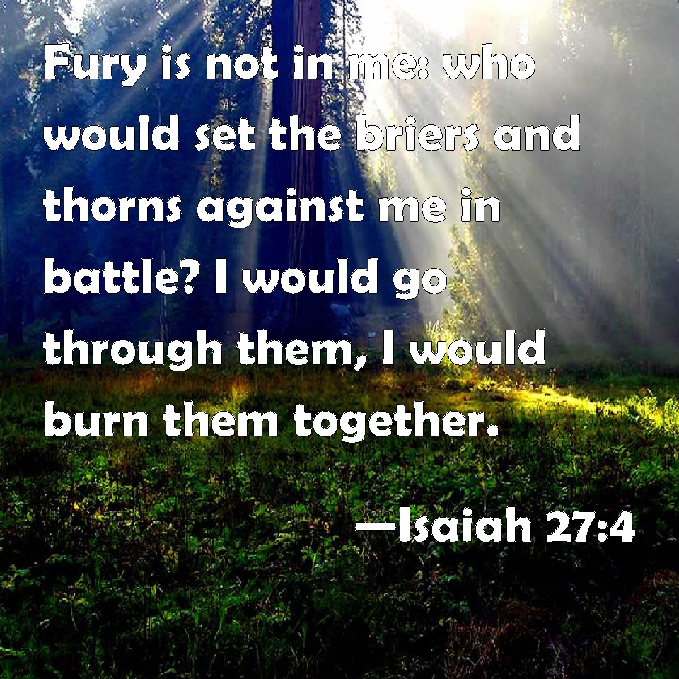 Isaiah 27:4 Fury is not in me: who would set the briers and thorns against me in battle? I would go through them, I would burn them together.
