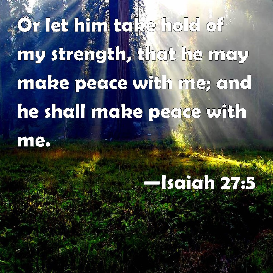 Choose a Background Isaiah 27:5 Or let him take hold of my strength, that he may make peace with me; and he shall make peace with me. KJV: Or let him take hold of my strength, that he may make peace with me; and he shall make peace with me. DRB: Or rather shall it take hold of my strength, shall it make peace with me, shall it make peace with me? DBT: Or let him take hold of my strength; let him make peace with me: yea, let him make peace with me. ERV: Or else let him take hold of my strength, that he may make peace with me; yea, let him make peace with me. WBT: Or let him take hold of my strength, that he may make peace with me, and he shall make peace with me. WEB: Or else let him take hold of my strength, that he may make peace with me. Let him make peace with me." YLT: Or — he doth take hold on My strength, He doth make peace with Me, Peace he doth make with Me.Links Isaiah 27:5 NIV • Isaiah 27:5 NLT • Isaiah 27:5 ESV • Isaiah 27:5 NASB • Isaiah 27:5 KJV • Isaiah 27:5 Interlinear • Isaiah 27:5 Commentaries • Isaiah 27:5 Parallel Texts • Isaiah 27:5 Bible Apps • Isaiah 27:5 Parallel • Bible Hub |