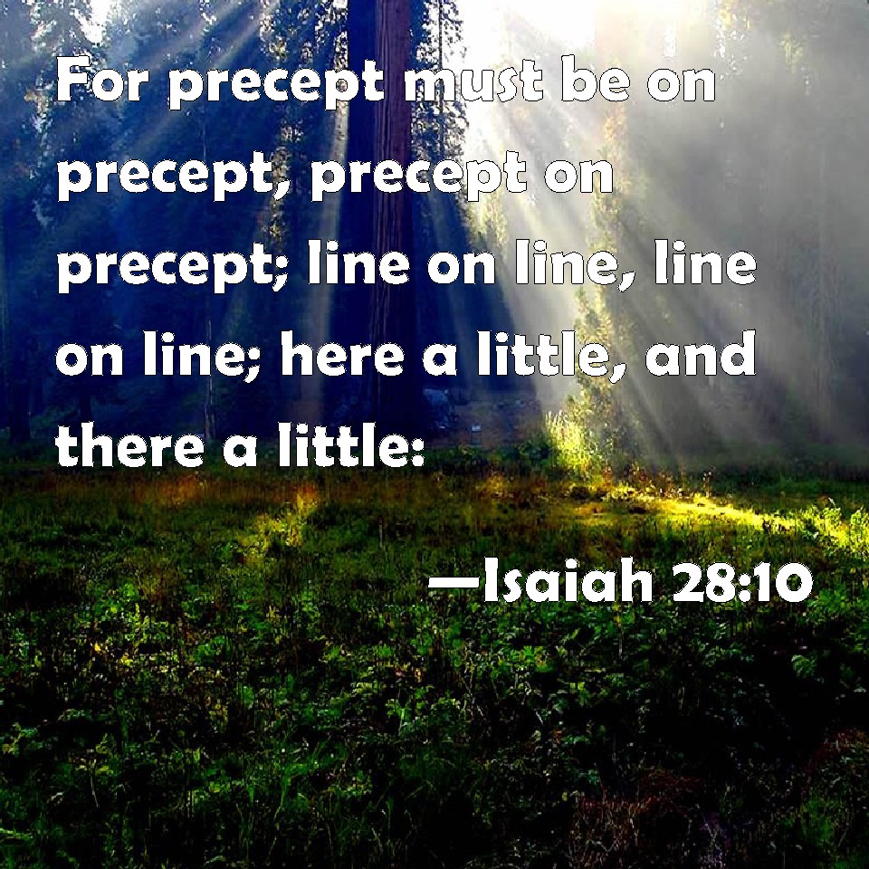 Choose a Background Isaiah 28:10 For precept must be on precept, precept on precept; line on line, line on line; here a little, and there a little: KJV: For precept must be upon precept, precept upon precept; line upon line, line upon line; here a little, and there a little: DRB: For command, command again; command, command again; expect, expect again; expect, expect again: a little there, a little there. DBT: For it is precept upon precept, precept upon precept; line upon line, line upon line; here a little, there a little. ... ERV: For it is precept upon precept, precept upon precept; line upon line, line upon line; here a little, there a little. WBT: For precept must be upon precept, precept upon precept; line upon line, line upon line; here a little, and there a little: WEB: For it is precept on precept, precept on precept; line on line, line on line; here a little, there a little. YLT: For rule is on rule, rule on rule, line on line, line on line, A little here, a little there,Links Isaiah 28:10 NIV • Isaiah 28:10 NLT • Isaiah 28:10 ESV • Isaiah 28:10 NASB • Isaiah 28:10 KJV • Isaiah 28:10 Interlinear • Isaiah 28:10 Commentaries • Isaiah 28:10 Parallel Texts • Isaiah 28:10 Bible Apps • Isaiah 28:10 Parallel • Bible Hub |