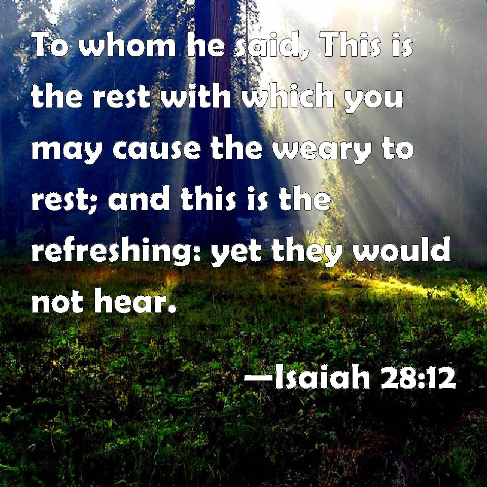 Choose a Background Isaiah 28:12 To whom he said, This is the rest with which you may cause the weary to rest; and this is the refreshing: yet they would not hear. KJV: To whom he said, This is the rest wherewith ye may cause the weary to rest; and this is the refreshing: yet they would not hear. DRB: To whom he said: This is my rest, refresh the weary, and this is my refreshing: and they would not hear. DBT: to whom he said, This is the rest: cause the weary to rest; and this is the refreshing. But they would not hear. ERV: to whom he said, This is the rest, give ye rest to him that is weary; and this is the refreshing: yet they would not hear. WBT: To whom he said, This is the rest with which ye may cause the weary to rest; and this is the refreshing: yet they would not hear. WEB: to whom he said, "This is the resting place. Give rest to weary;" and "This is the refreshing;" yet they would not hear. YLT: Unto whom He hath said, 'This is the rest, give ye rest to the weary, And this — the refreshing:' And they have not been willing to hear,Links Isaiah 28:12 NIV • Isaiah 28:12 NLT • Isaiah 28:12 ESV • Isaiah 28:12 NASB • Isaiah 28:12 KJV • Isaiah 28:12 Interlinear • Isaiah 28:12 Commentaries • Isaiah 28:12 Parallel Texts • Isaiah 28:12 Bible Apps • Isaiah 28:12 Parallel • Bible Hub |