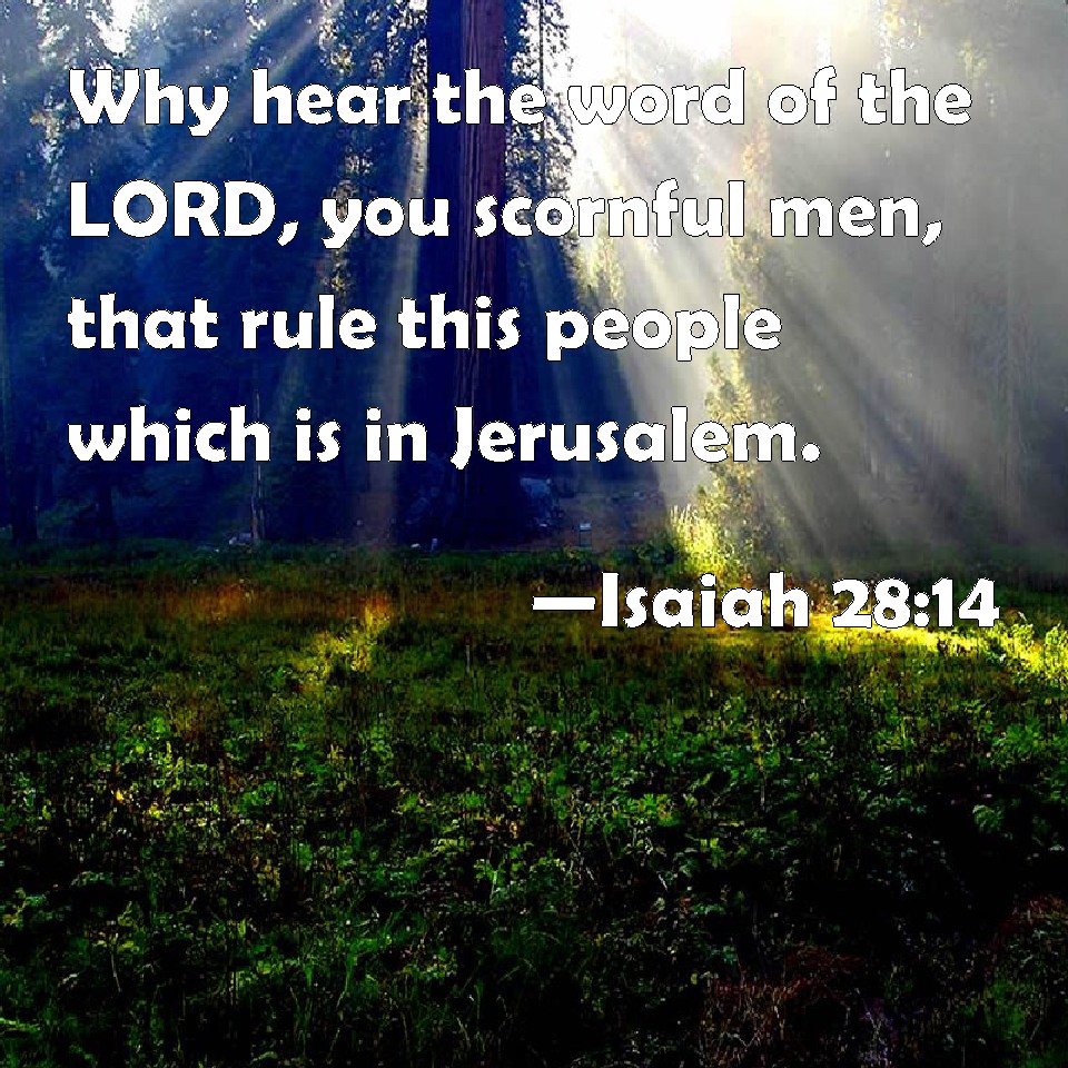 Choose a Background Isaiah 28:14 Why hear the word of the LORD, you scornful men, that rule this people which is in Jerusalem. KJV: Wherefore hear the word of the LORD, ye scornful men, that rule this people which is in Jerusalem. DRB: Wherefore hear the word of the Lord, ye scornful men, who rule over my people that is in Jerusalem. DBT: Therefore hear the word of Jehovah, ye scornful men, that rule this people which is in Jerusalem. ERV: Wherefore hear the word of the LORD, ye scornful men, that rule this people which is in Jerusalem: WBT: Wherefore hear the word of the LORD, ye scornful men, that rule this people which is in Jerusalem. WEB: Therefore hear the word of Yahweh, you scoffers, that rule this people in Jerusalem: YLT: Therefore, hear a word of Jehovah, ye men of scorning, Ruling this people that is in Jerusalem.Links Isaiah 28:14 NIV • Isaiah 28:14 NLT • Isaiah 28:14 ESV • Isaiah 28:14 NASB • Isaiah 28:14 KJV • Isaiah 28:14 Interlinear • Isaiah 28:14 Commentaries • Isaiah 28:14 Parallel Texts • Isaiah 28:14 Bible Apps • Isaiah 28:14 Parallel • Bible Hub |