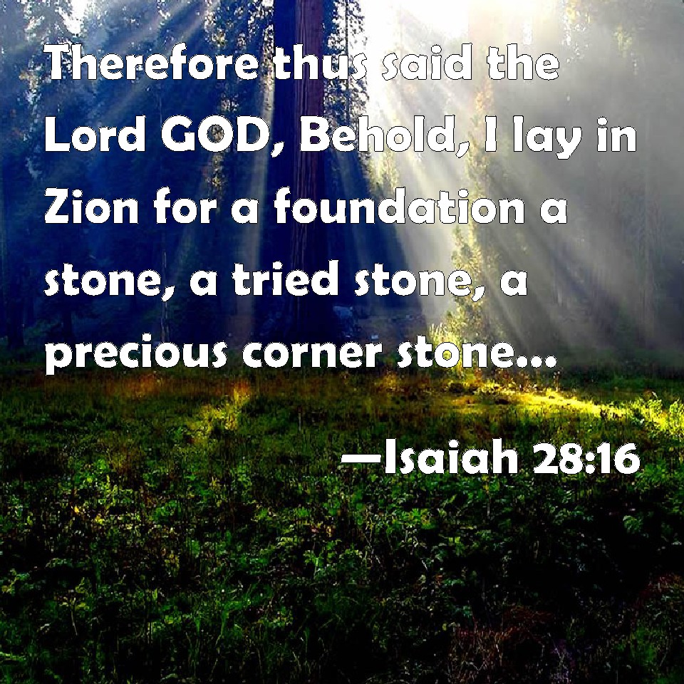 Choose a Background Isaiah 28:16 Therefore thus said the Lord GOD, Behold, I lay in Zion for a foundation a stone, a tried stone, a precious corner stone, a sure foundation: he that believes shall not make haste. KJV: Therefore thus saith the Lord GOD, Behold, I lay in Zion for a foundation a stone, a tried stone, a precious corner stone, a sure foundation: he that believeth shall not make haste. DRB: Therefore thus saith the Lord God: Behold I will lay a stone in the foundations of Sion, a tried stone, a corner stone, a precious stone, founded in the foundation. He that believeth, let him not hasten. DBT: Therefore thus saith the Lord Jehovah: Behold, I lay for foundation in Zion a stone, a tried stone, a precious corner-stone, a sure foundation: he that trusteth shall not make haste. ERV: therefore thus saith the Lord GOD, Behold, I lay in Zion for a foundation a stone, a tried stone, a precious corner stone of sure foundation: he that believeth shall not make haste. WBT: Therefore thus saith the Lord GOD, Behold, I lay in Zion for a foundation a stone, a tried stone, a precious corner stone, a sure foundation: he that believeth shall not make haste. WEB: Therefore thus says the Lord Yahweh, "Behold, I lay in Zion for a foundation a stone, a tried stone, a precious cornerstone of a sure foundation. He who believes shall not act hastily. YLT: Therefore, thus said the Lord Jehovah: 'Lo, I am laying a foundation in Zion, A stone — a tried stone, a corner stone precious, a settled foundation, He who is believing doth not make haste.Links Isaiah 28:16 NIV • Isaiah 28:16 NLT • Isaiah 28:16 ESV • Isaiah 28:16 NASB • Isaiah 28:16 KJV • Isaiah 28:16 Interlinear • Isaiah 28:16 Commentaries • Isaiah 28:16 Parallel Texts • Isaiah 28:16 Bible Apps • Isaiah 28:16 Parallel • Bible Hub |