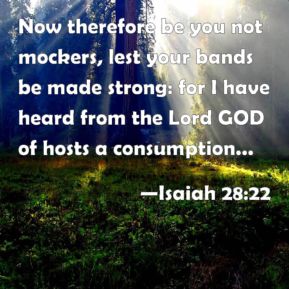 Choose a Background Isaiah 28:22 Now therefore be you not mockers, lest your bands be made strong: for I have heard from the Lord GOD of hosts a consumption, even determined on the whole earth. KJV: Now therefore be ye not mockers, lest your bands be made strong: for I have heard from the Lord GOD of hosts a consumption, even determined upon the whole earth. DRB: And now do not mock, lest your bonds be tied strait. For I have heard of the Lord the God of hosts a consumption and a cutting short upon all the earth. DBT: Now therefore be ye not scorners, lest your bonds be made strong; for I have heard from the Lord Jehovah of hosts a consumption, and one determined, upon the whole land. ERV: Now therefore be ye not scorners, lest your bands be made strong: for a consummation, and that determined, have I heard from the Lord, the LORD of hosts, upon the whole earth. WBT: Now therefore be ye not mockers, lest your bands be made strong: for I have heard from the Lord GOD of hosts a consumption, even determined upon the whole earth. WEB: Now therefore don't be scoffers, lest your bonds be made strong; for I have heard a decree of destruction from the Lord, Yahweh of Armies, on the whole earth. YLT: And now, show not yourselves scorners, Lest strong be your bands, For a consumption, that is determined, I have heard, by the Lord, Jehovah of Hosts, Is for all the land.Links Isaiah 28:22 NIV • Isaiah 28:22 NLT • Isaiah 28:22 ESV • Isaiah 28:22 NASB • Isaiah 28:22 KJV • Isaiah 28:22 Interlinear • Isaiah 28:22 Commentaries • Isaiah 28:22 Parallel Texts • Isaiah 28:22 Bible Apps • Isaiah 28:22 Parallel • Bible Hub |