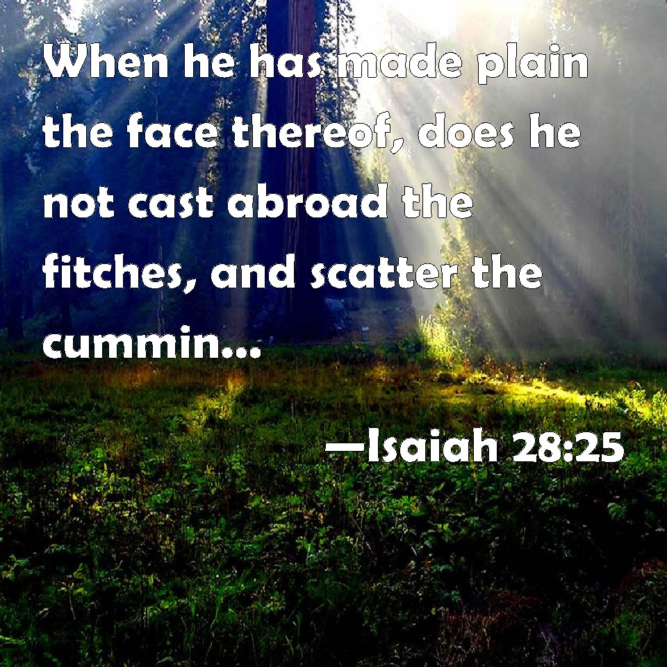 Choose a Background Isaiah 28:25 When he has made plain the face thereof, does he not cast abroad the fitches, and scatter the cummin, and cast in the principal wheat and the appointed barley and the rye in their place? KJV: When he hath made plain the face thereof, doth he not cast abroad the fitches, and scatter the cummin, and cast in the principal wheat and the appointed barley and the rie in their place? DRB: Will he not, when he hath made plain the surface thereof, sow gith, and scatter cummin, and put wheat in order, and barley, and millet, and vetches in their bounds? DBT: Doth he not, when he hath levelled the face thereof, cast abroad dill, and scatter cummin, and set the wheat in rows, and the barley in an appointed place, and the rye in its border? ERV: When he hath made plain the face thereof, doth he not cast abroad the fitches, and scatter the cummin, and put in the wheat in rows and the barley in the appointed place and the spelt in the border thereof? WBT: When he hath made even the face of it, doth he not cast abroad the vetches, and scatter the cummin, and cast in the principal wheat, and the appointed barley, and the rye in their place? WEB: When he has leveled its surface, doesn't he plant the dill, and scatter the cumin seed, and put in the wheat in rows, the barley in the appointed place, and the spelt in its place? YLT: Hath he not, if he have made level its face, Then scattered fitches, and cummin sprinkle, And hath placed the principal wheat, And the appointed barley, And the rie in its own border?Links Isaiah 28:25 NIV • Isaiah 28:25 NLT • Isaiah 28:25 ESV • Isaiah 28:25 NASB • Isaiah 28:25 KJV • Isaiah 28:25 Interlinear • Isaiah 28:25 Commentaries • Isaiah 28:25 Parallel Texts • Isaiah 28:25 Bible Apps • Isaiah 28:25 Parallel • Bible Hub |