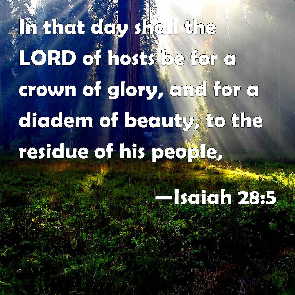 Choose a Background Isaiah 28:5 In that day shall the LORD of hosts be for a crown of glory, and for a diadem of beauty, to the residue of his people, KJV: In that day shall the LORD of hosts be for a crown of glory, and for a diadem of beauty, unto the residue of his people, DRB: In that day the Lord of hosts shall be a crown of glory, and a garland of joy to the residue of his people: DBT: In that day will Jehovah of hosts be for a crown of glory, and for a diadem of beauty, unto the remnant of his people; ERV: In that day shall the LORD of hosts be for a crown of glory, and for a diadem of beauty, unto the residue of his people: WBT: In that day will the LORD of hosts be for a crown of glory, and for a diadem of beauty, to the residue of his people, WEB: In that day, Yahweh of Armies will become a crown of glory, and a diadem of beauty, to the residue of his people; YLT: In that day is Jehovah of Hosts For a crown of beauty, and for a diadem of glory, To the remnant of His people.Links Isaiah 28:5 NIV • Isaiah 28:5 NLT • Isaiah 28:5 ESV • Isaiah 28:5 NASB • Isaiah 28:5 KJV • Isaiah 28:5 Interlinear • Isaiah 28:5 Commentaries • Isaiah 28:5 Parallel Texts • Isaiah 28:5 Bible Apps • Isaiah 28:5 Parallel • Bible Hub |