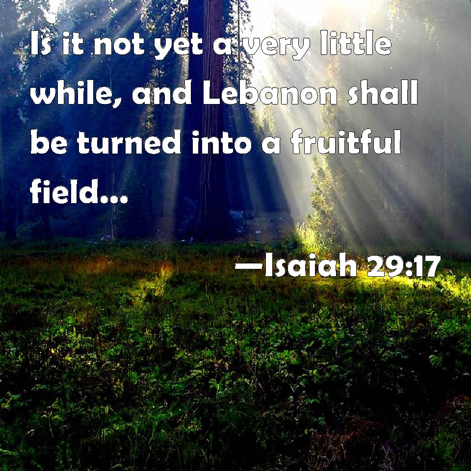 Choose a Background Isaiah 29:17 Is it not yet a very little while, and Lebanon shall be turned into a fruitful field, and the fruitful field shall be esteemed as a forest? KJV: Is it not yet a very little while, and Lebanon shall be turned into a fruitful field, and the fruitful field shall be esteemed as a forest? DRB: Is it not yet a very little while, and Libanus shall be turned into charmel, and charmel shall be esteemed as a forest? DBT: Is it not yet a very little while, and Lebanon shall be turned into a fruitful field, and the fruitful field shall be esteemed as a forest? ERV: Is it not yet a very little while, and Lebanon shall be turned into a fruitful field, and the fruitful field shall be counted for a forest? WBT: Is it not yet a very little while, and Lebanon shall be turned into a fruitful field, and the fruitful field shall be esteemed as a forest? WEB: Isn't it yet a very little while, and Lebanon will be turned into a fruitful field, and the fruitful field will be regarded as a forest? YLT: Is it not yet a very little, And turned hath Lebanon to a fruitful field, And the fruitful field for a forest is reckoned?Links Isaiah 29:17 NIV • Isaiah 29:17 NLT • Isaiah 29:17 ESV • Isaiah 29:17 NASB • Isaiah 29:17 KJV • Isaiah 29:17 Interlinear • Isaiah 29:17 Commentaries • Isaiah 29:17 Parallel Texts • Isaiah 29:17 Bible Apps • Isaiah 29:17 Parallel • Bible Hub |